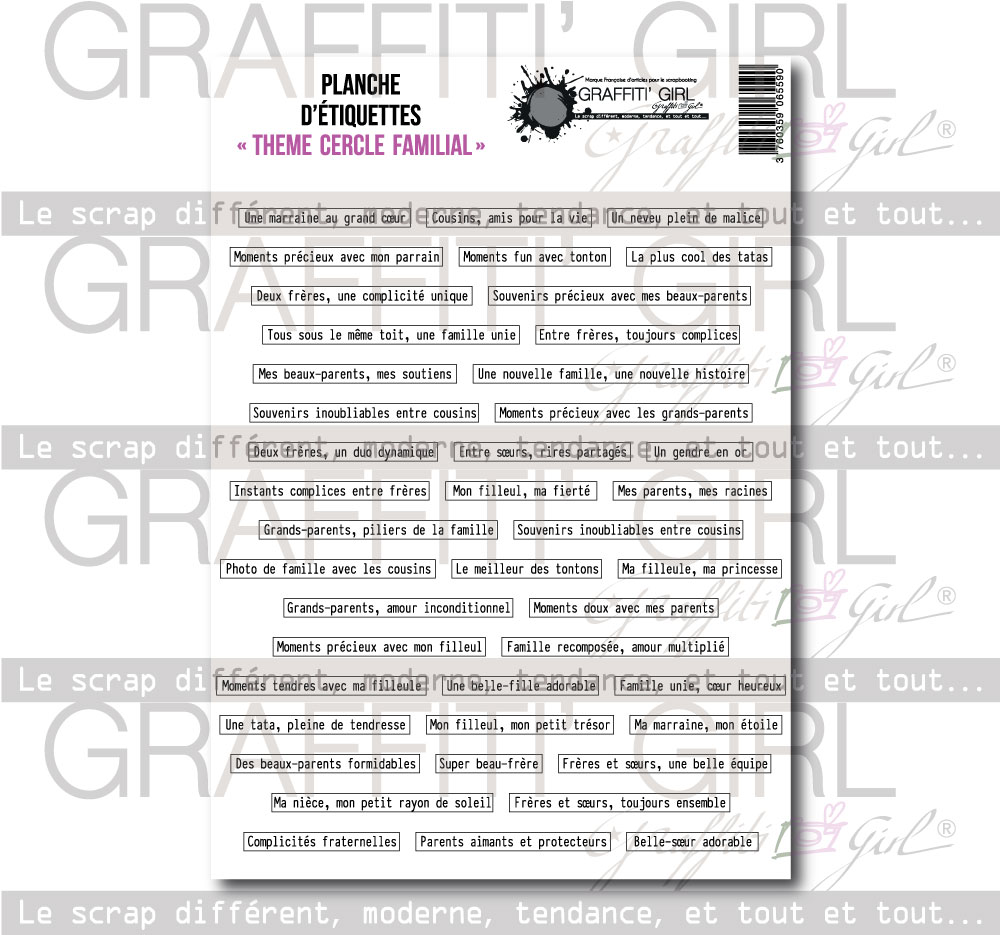 Description : Célébrez les liens familiaux avec cette planche d’étiquettes centrée sur le thème du cercle familial. Chaque étiquette porte une inscription touchante qui reflète les relations spéciales entre membres de la famille, comme « Un neveu plein de malice », « Complicités fraternelles », et « Grands-parents, amour inconditionnel ». Parfait pour enrichir vos albums photo familiaux, journaux intimes ou projets de scrapbooking.