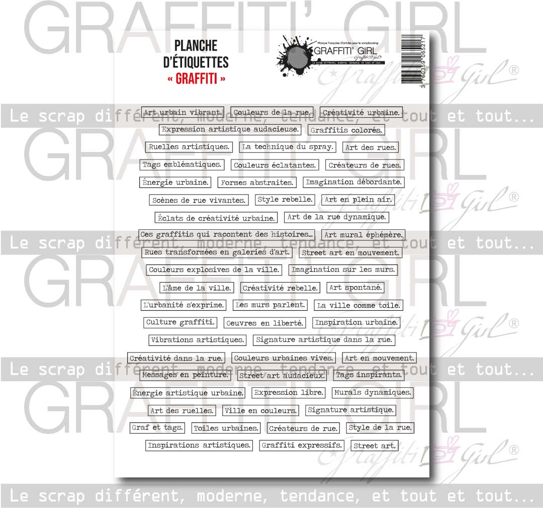 Transformez vos projets de scrapbooking en toiles urbaines avec notre Planche d’Étiquettes Thème Graffiti. Idéales pour les amateurs de scrapbooking, les artistes de journaling, ou simplement pour ceux qui cherchent à exprimer leur style de vie urbain, ces étiquettes sont une fenêtre ouverte sur l’univers du graffiti.