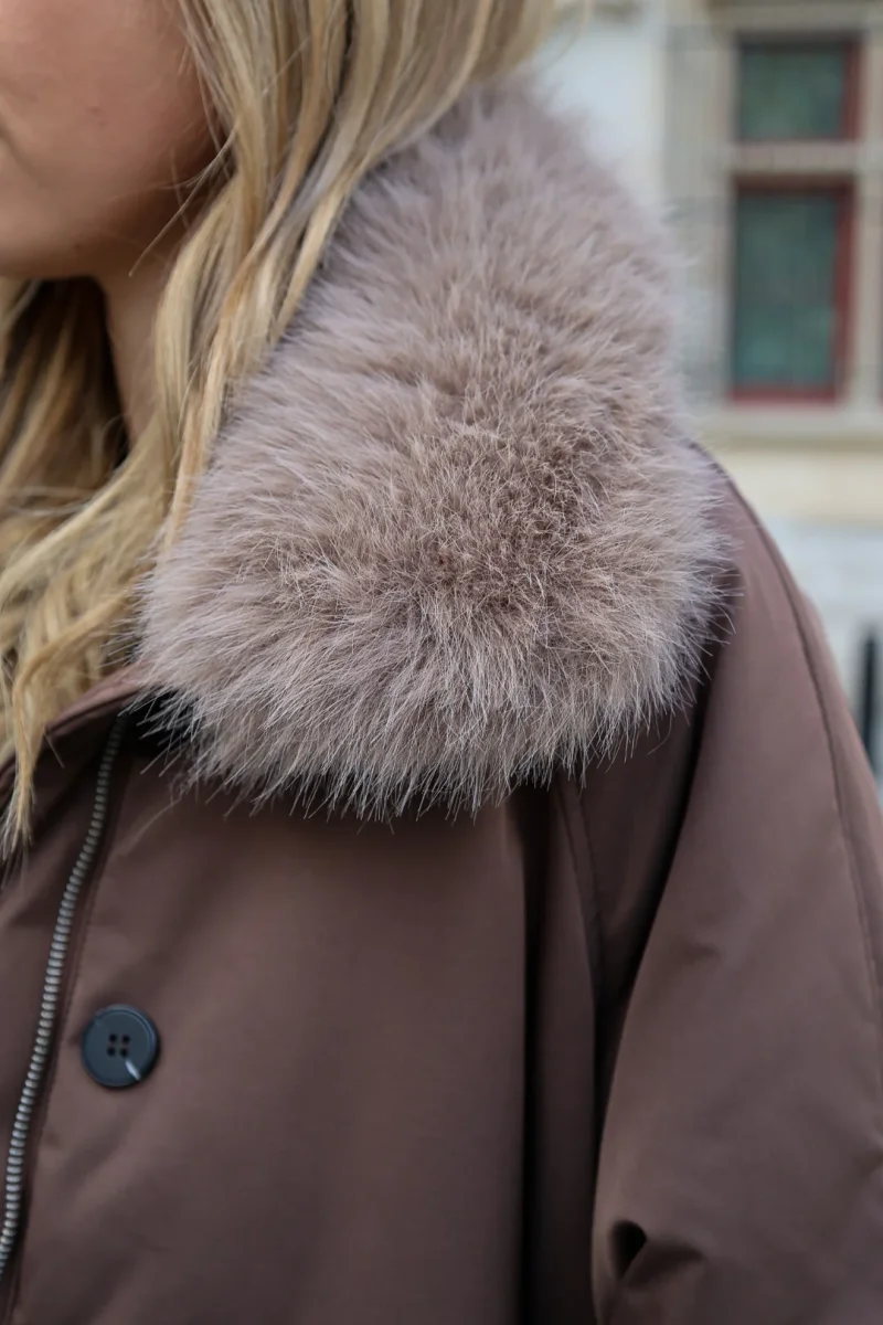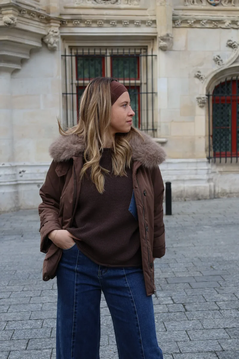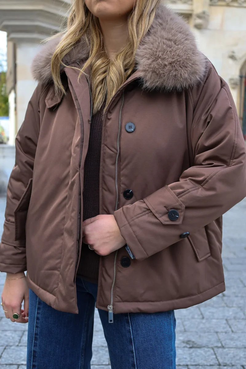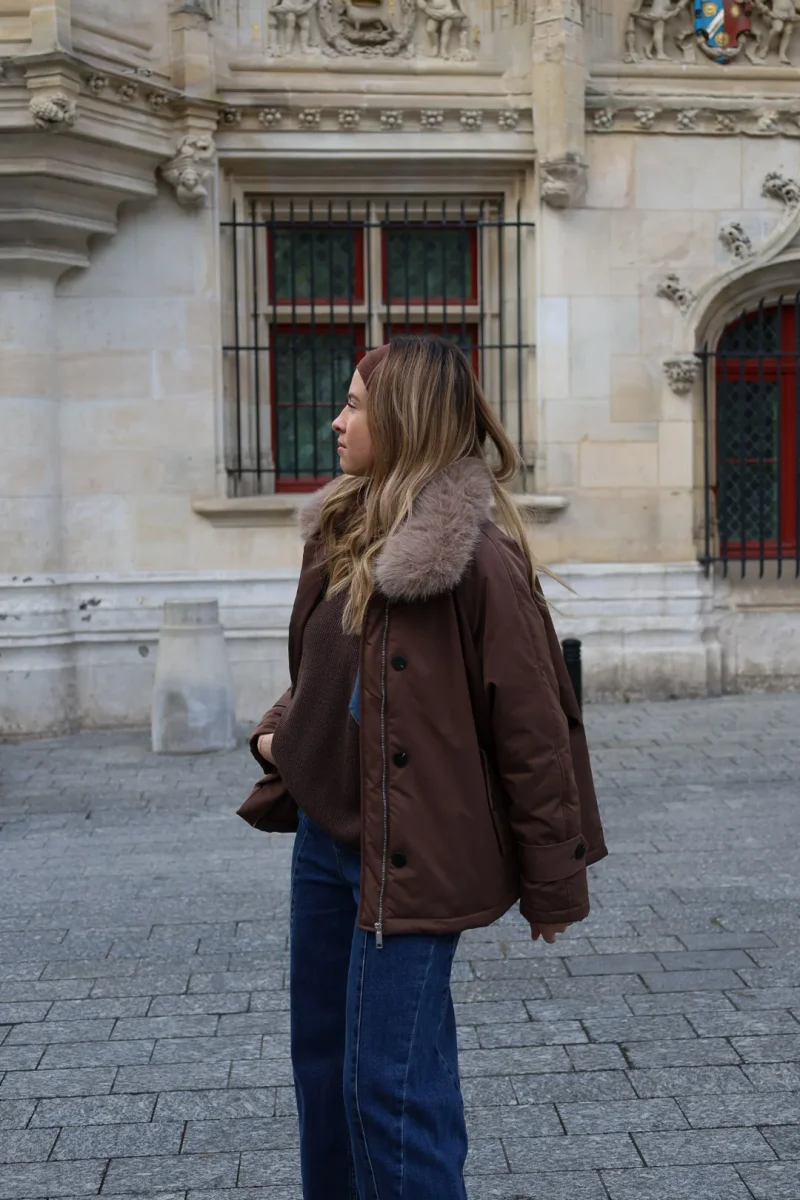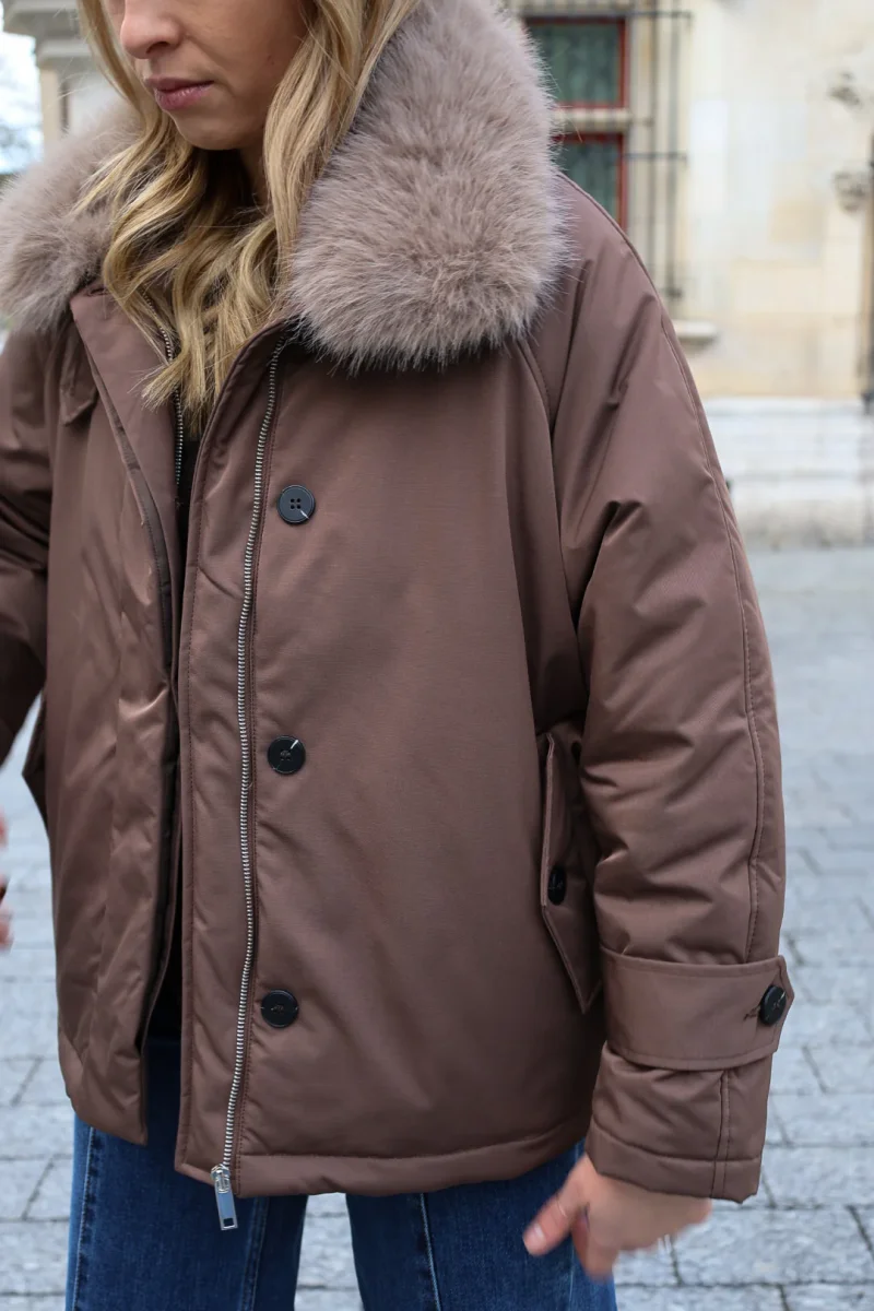 Taille S M L Jade porte la taille S Prendre sa taille habituelle Fourrure 100% Synthétique Fermeture zip + boutons Fourrure amovible Pas de capuche Déperlant Lavage à sec