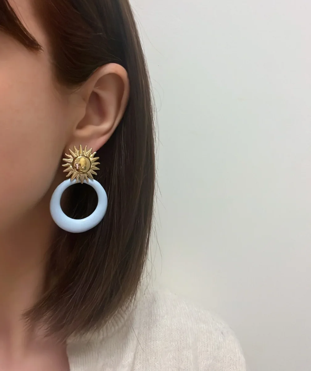 Inspirées des astres, ces boucles d’oreilles pendantes allient le charme du soleil doré et la modernité d’un anneau bleu pastel pour un look unique.