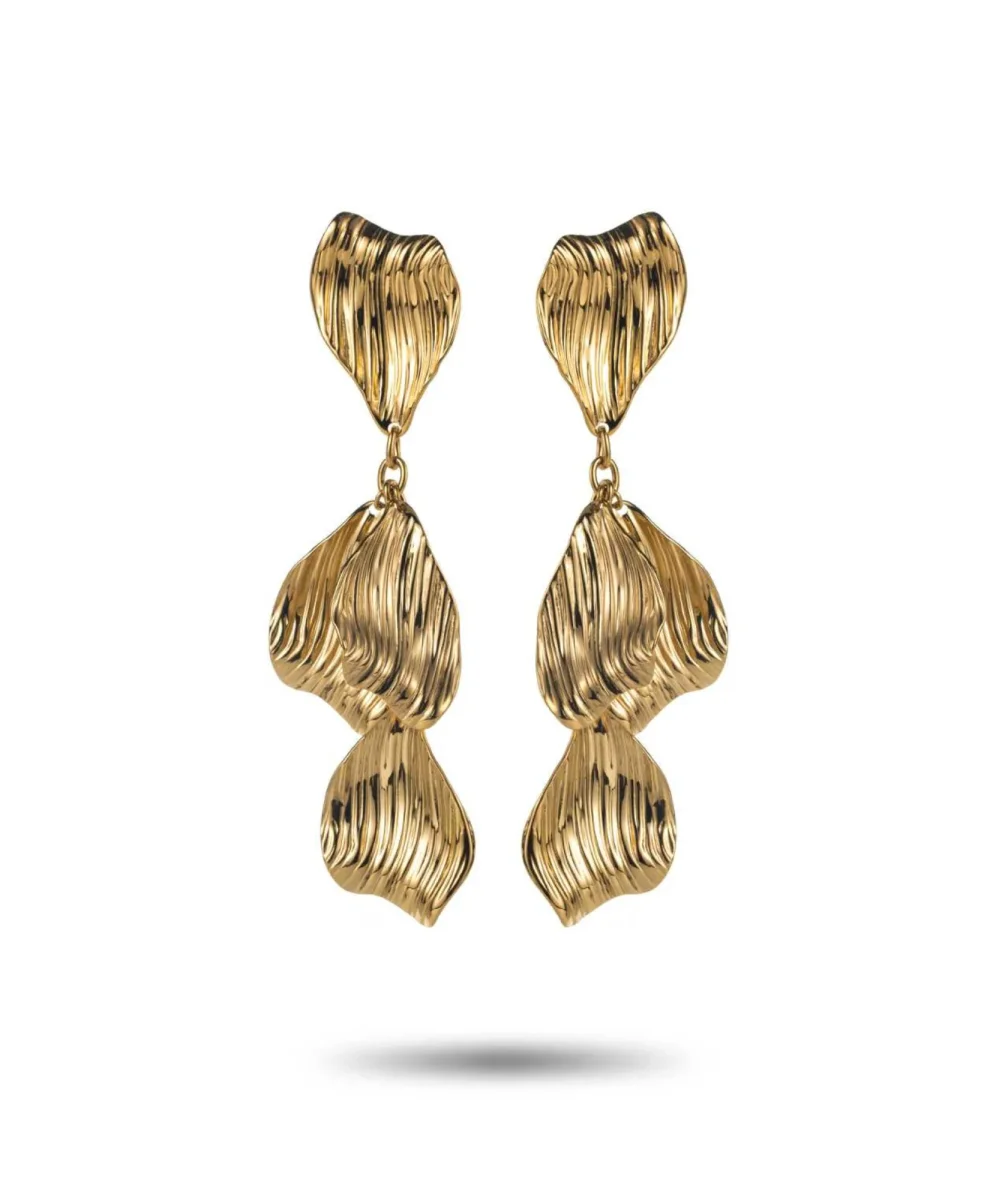 Fais sensation avec ces boucles d’oreilles pendantes dorées au design plissé. Leur forme ondulée évoque une élégance naturelle et fluide, parfaite pour sublimer une coiffure relevée ou un look de fête. Légères malgré leur volume, elles assurent une allure sophistiquée et affirmée.