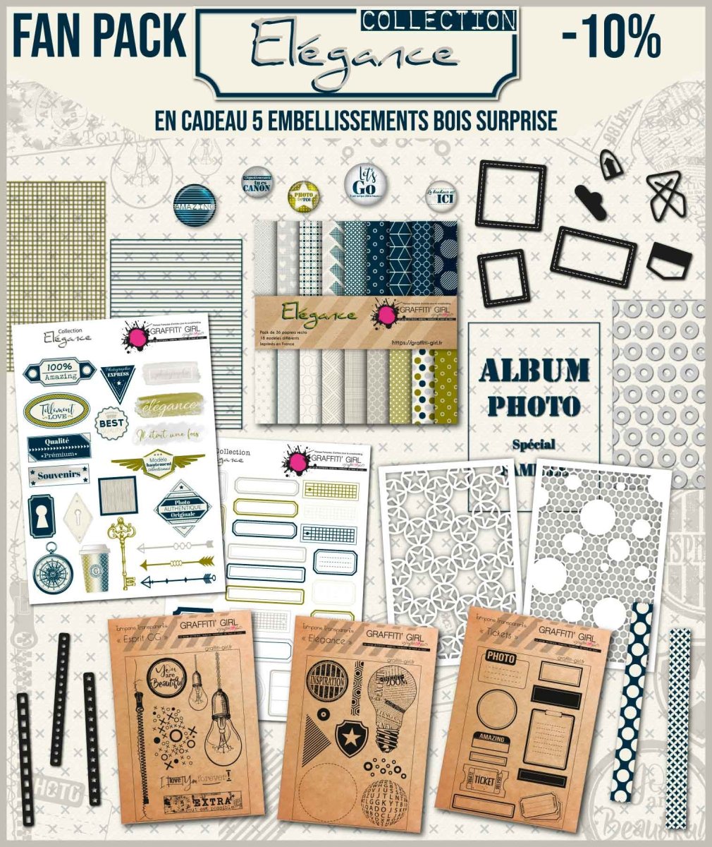 Nom du produit : Pack Elégance Produit: Pack collection complète Marque: Graffiti Girl Collection: Elégance Le petit plus: 10% et un lot de 5 embellissements bois surprise en cadeaux. Utilisation: Kit complet de scrap pour réaliser tout type de projet en scrapbooking.