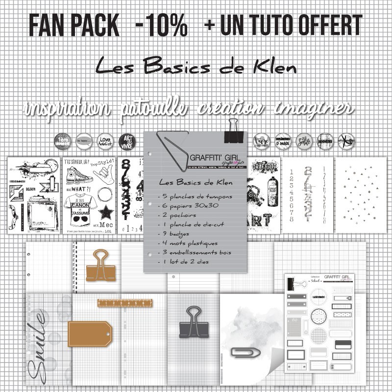 Voici le généreux fan pack « Les basics » de la marque Graffiti Girl. Il comprend 13 produits de scrapbooking dont 5 planche de tampons transparents : Chiffres, Beaux-arts, Jeun’s, Street art, Destroy. Ce pack de produits scrapbooking dans le thème du noir et blanc comprends des produits qui ont des motifs, des dessins et des textes qui sont essentiels dans le monde du scrapbooking. Découvrez ainsi « Les basics » qui vous accompagneront pour de nombreux projets de scrapbooking à travers ses différents style que sont le grunge, le clean, le numérique, le graphique. Il y’en a pour tous les goûts et ses produits sont facilement utilisables pour page de scrap, carte de scrap, home déco ou tout autre idée !