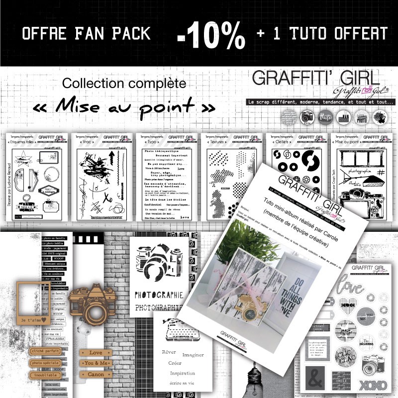 Voici le généreux fan pack « Mise au point » de la marque Graffiti Girl. Il comprend 13 produits de scrapbooking dont 6 planche de tampons transparents : Oeillets, Typo, Vrac, Mise au point, Textures et Etiquettes. Ce pack de produits scrapbooking dans le thème du noir et blanc comprends des produits qui ont des motifs, des dessins et des textes qui font référence au monde de la photographie . Découvrez ainsi « Mise au point » qui vous guidera pour de nombreux projets de scrapbooking comme une page de scrap ou une carte de scrap à travers ses différents style que sont le grunge, le freestyle, le géométrique, le graphique. Il y’en a pour tous les goûts et ses produits sont facilement utilisables pour page de scrap, carte de scrap, home déco ou tout autre idée !