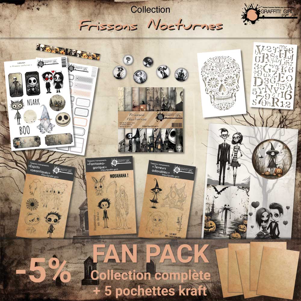 Plongez dans l’ambiance mystique de Halloween avec le Fan Pack “Frissons Nocturnes” de Graffiti Girl. Ce pack exclusif rassemble tout le nécessaire pour créer des œuvres scrapbooking à thème Halloween, enrichi d’une variété d’accessoires pour inspirer votre créativité.