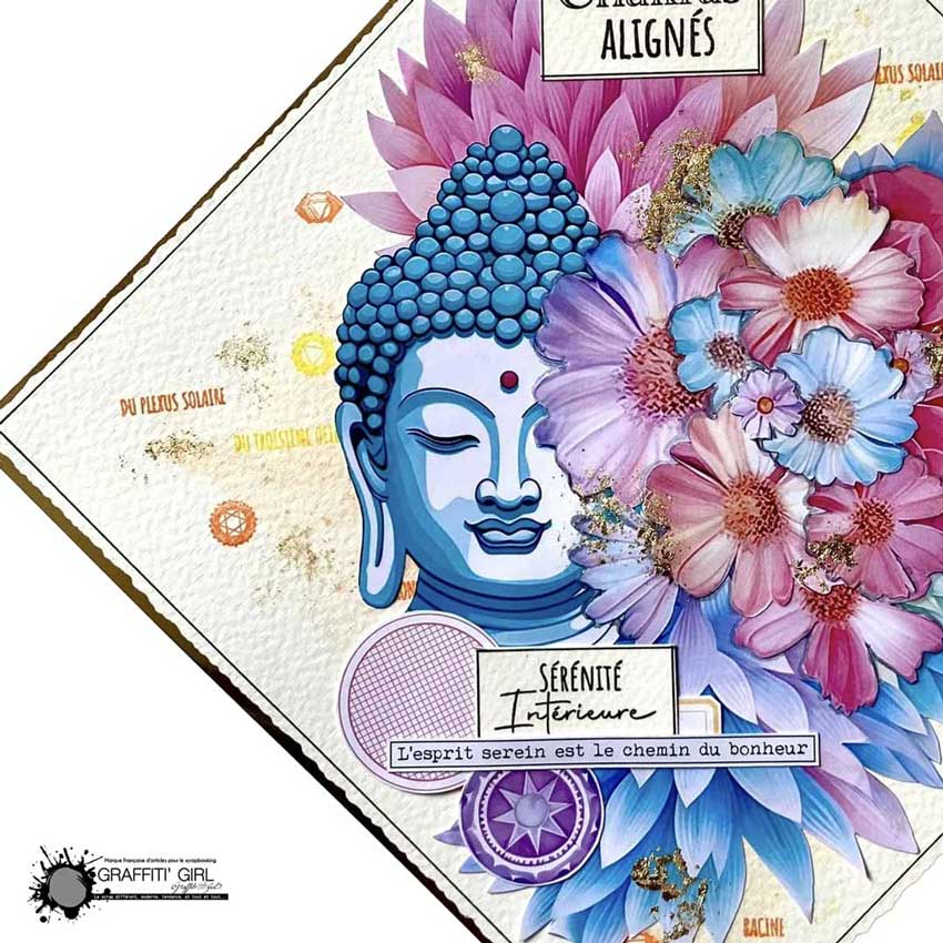 - 4 planches de tampons transparents : Bouddha, Arbre de Vie, Chakras, et Lecture, chacune offrant une plongée unique dans des thèmes de bien-être et de spiritualité.