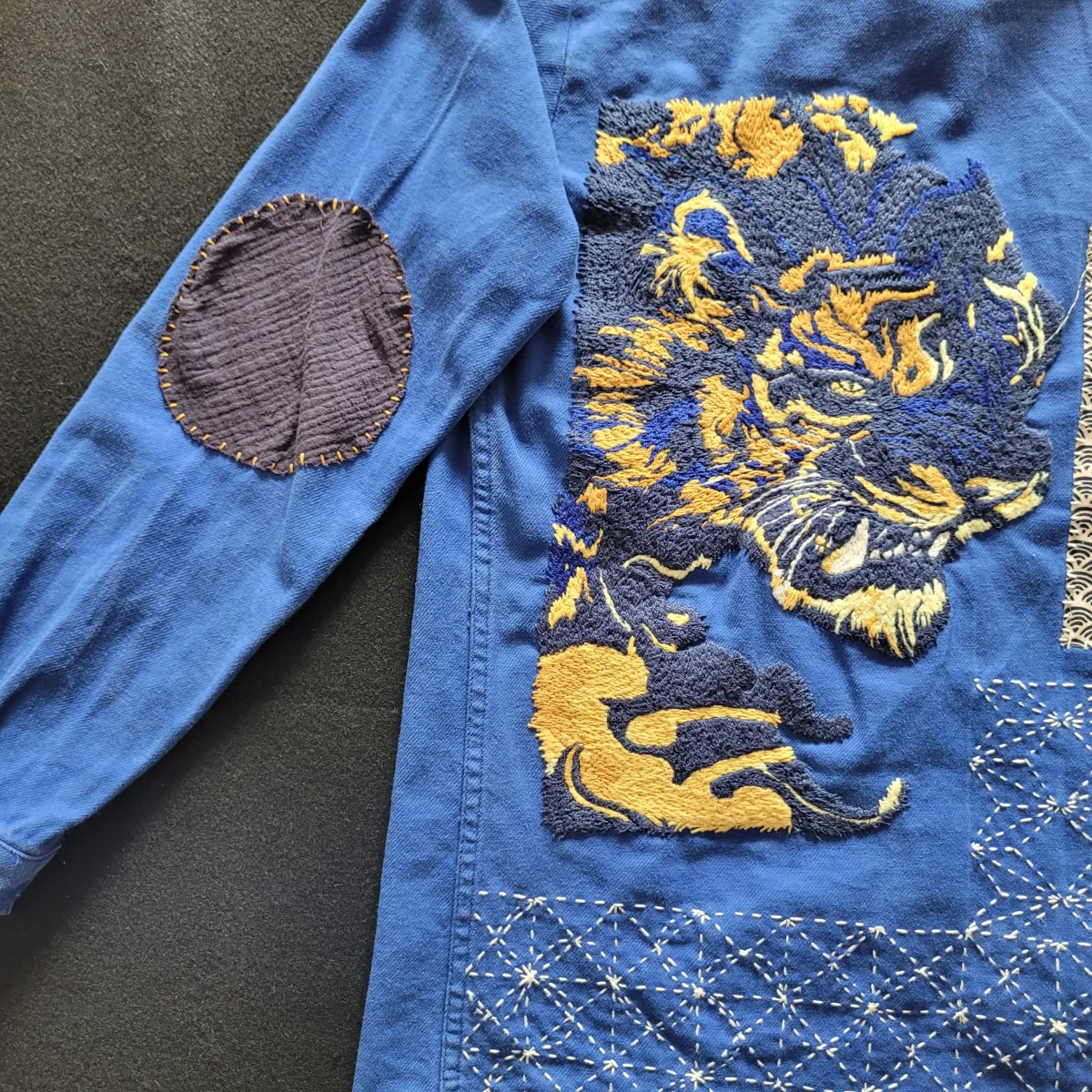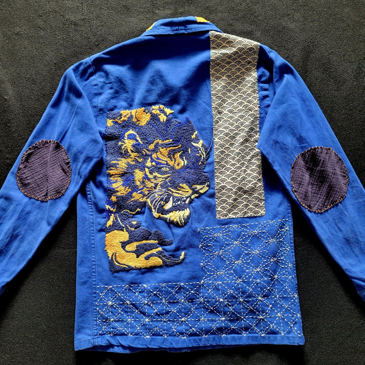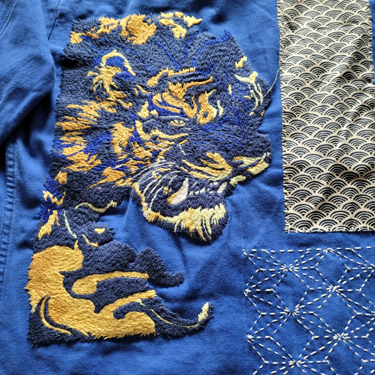 Veste de travail française des années 50/60 brodée à la main et personnalisée d’un tigre et de sashiko( broderie japonaise au niveau de la dorsale) ainsi que des rapiecements de tissus anciens que l’on appelle Boro devant et derrière.
