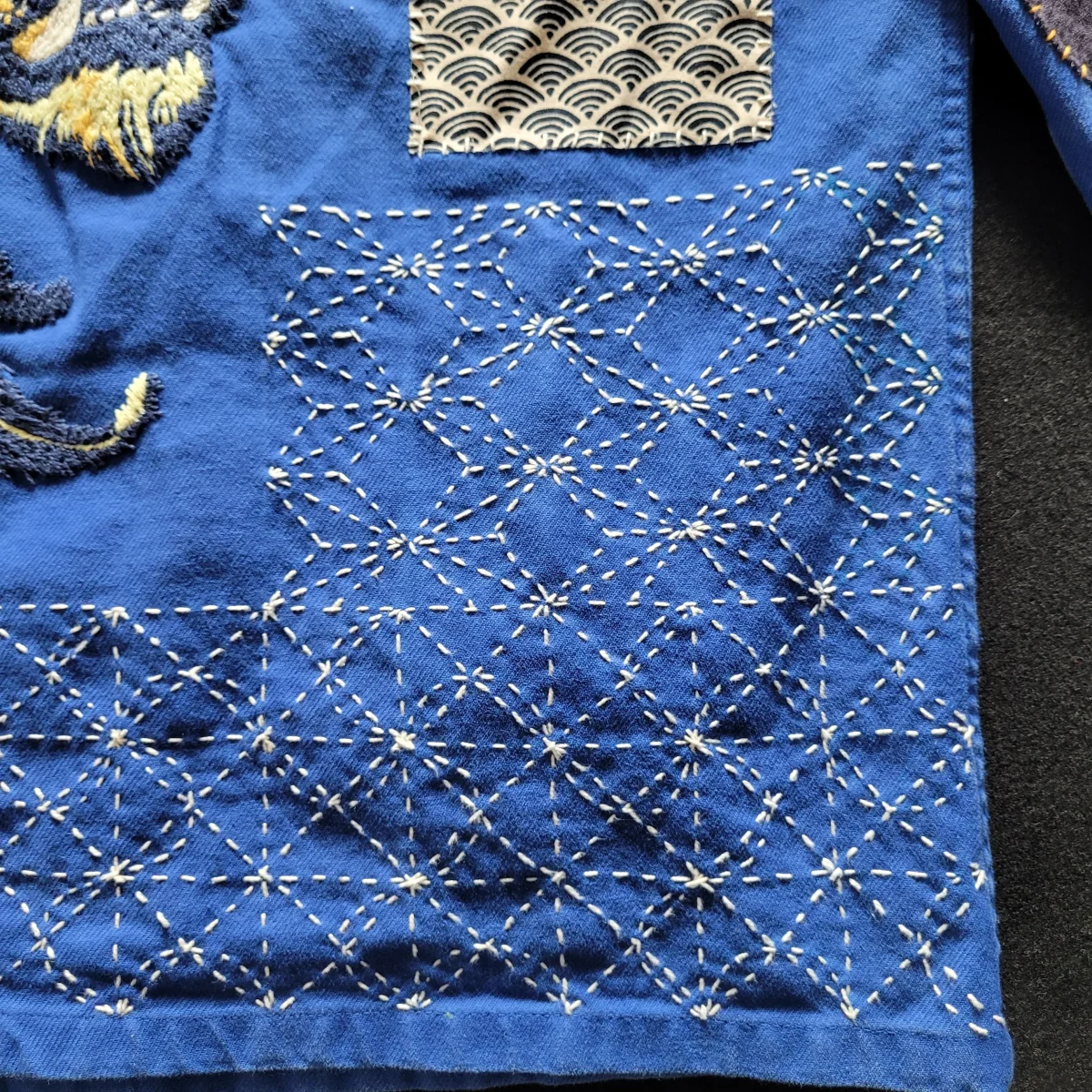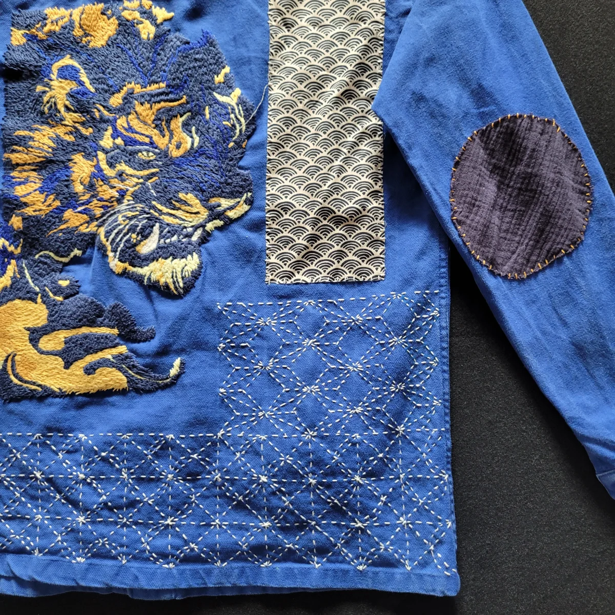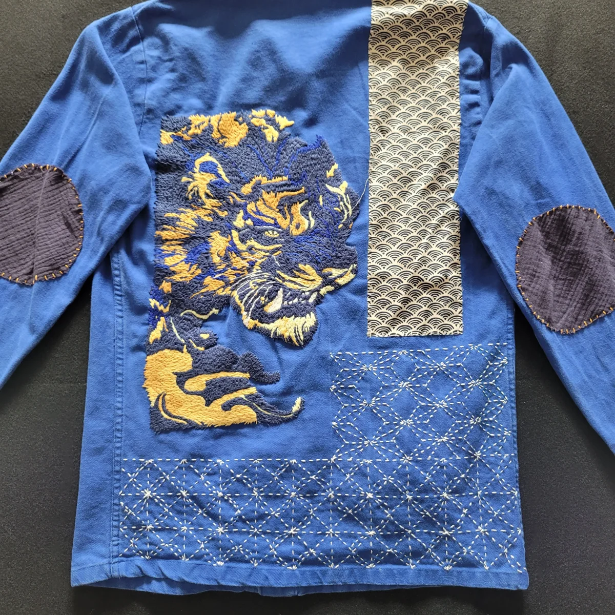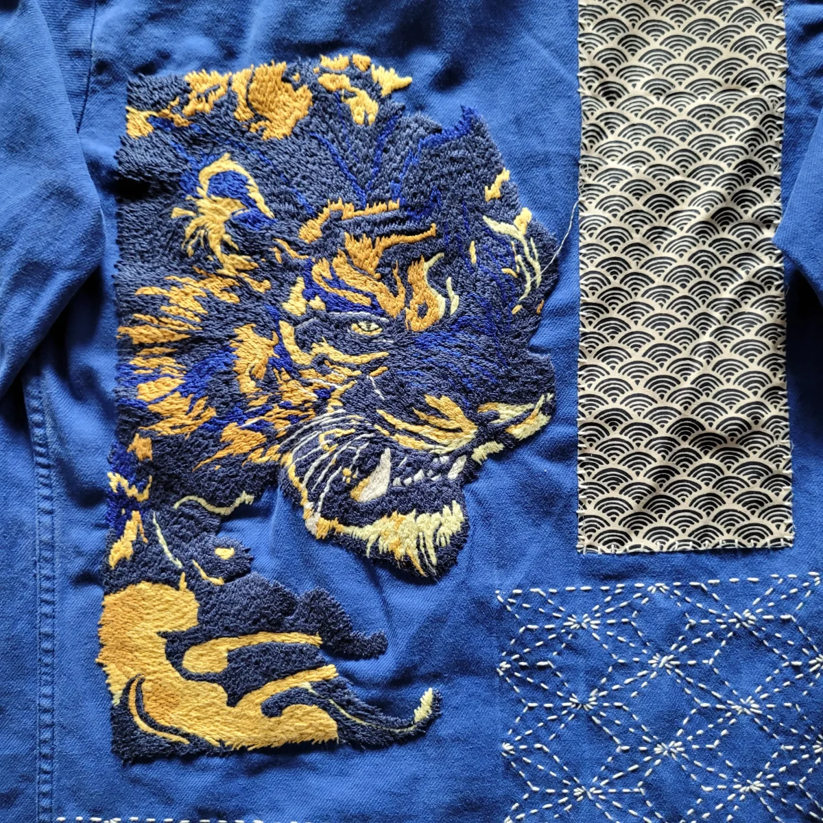 Veste de travail française des années 50/60 brodée à la main et personnalisée d’un tigre et de sashiko( broderie japonaise au niveau de la dorsale) ainsi que des rapiecements de tissus anciens que l’on appelle Boro devant et derrière.