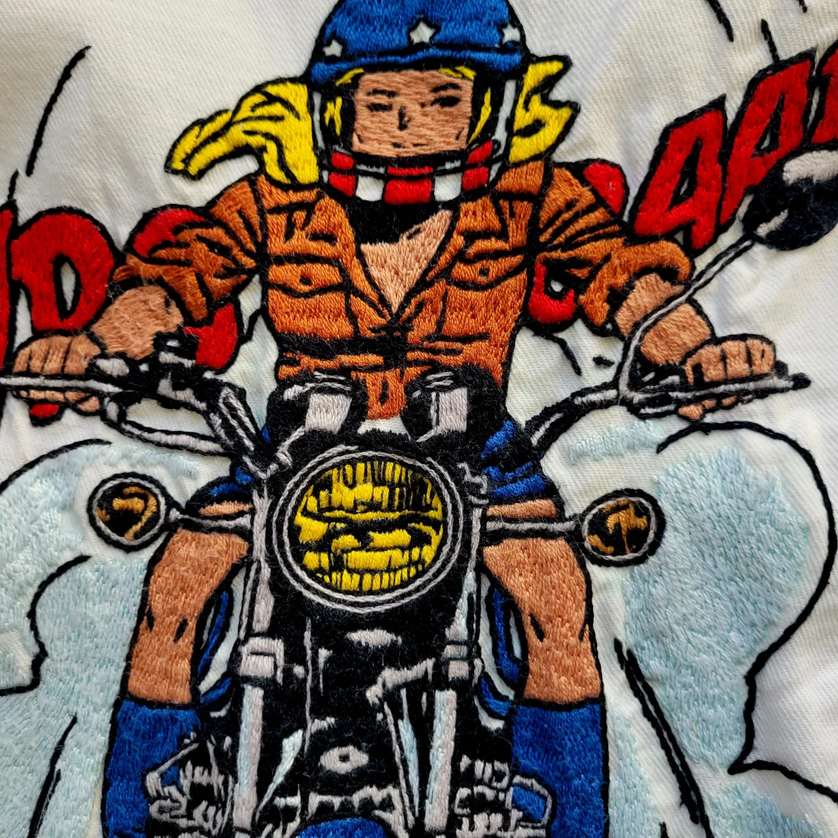 Jacket white workwear from the 50’s Evel Knievel hand embroidered chainstitch/veste ouvrière brodée main point de chaînette