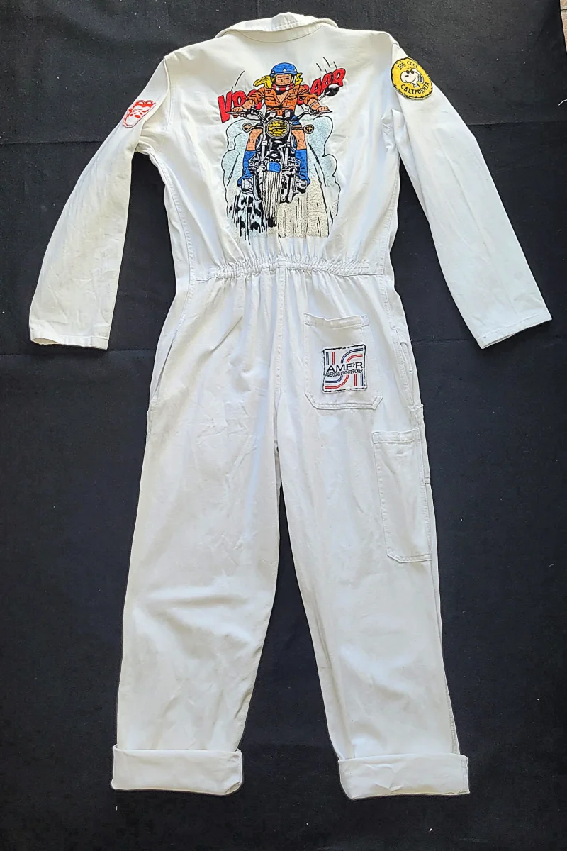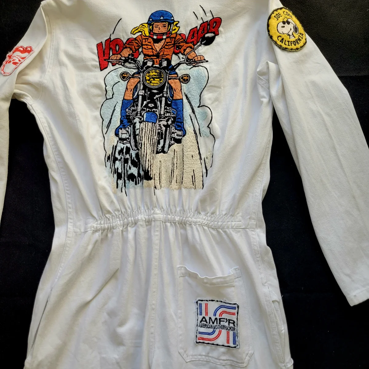 Handembroidery Vintage White Coverall « The Girl on motorcycle » signed by Punk and Coton