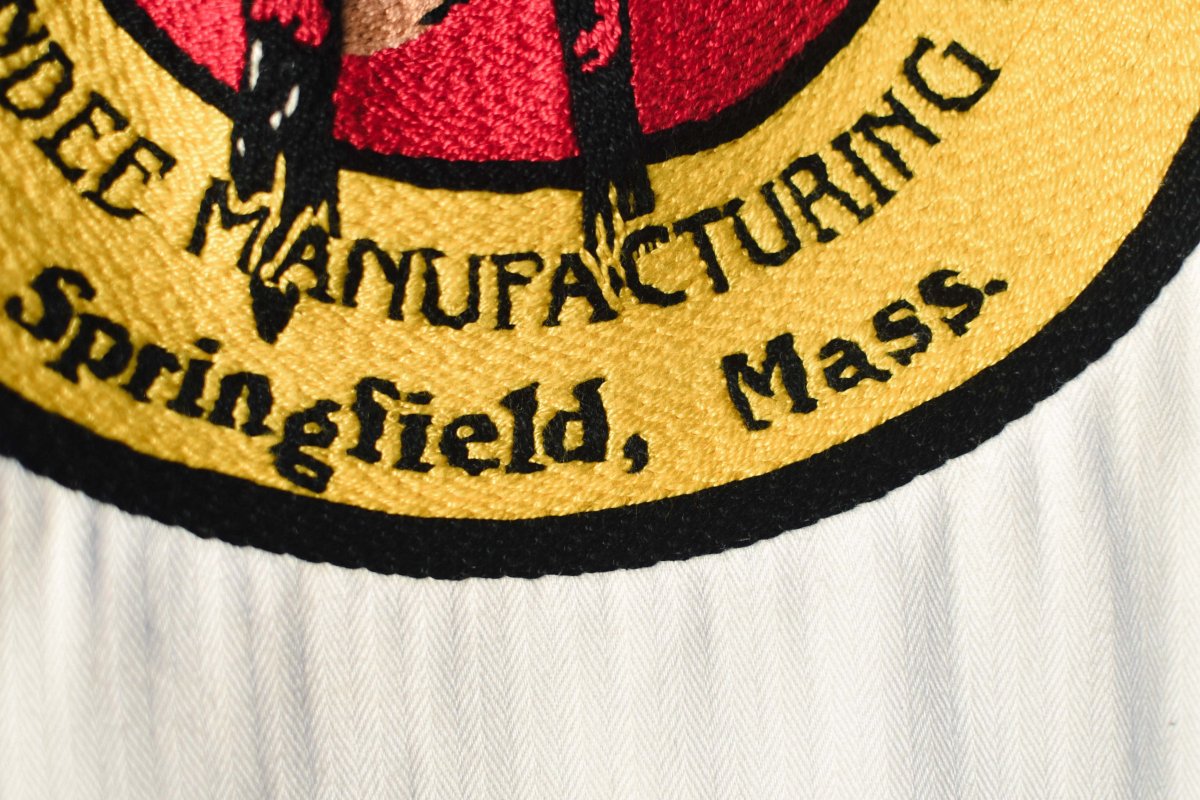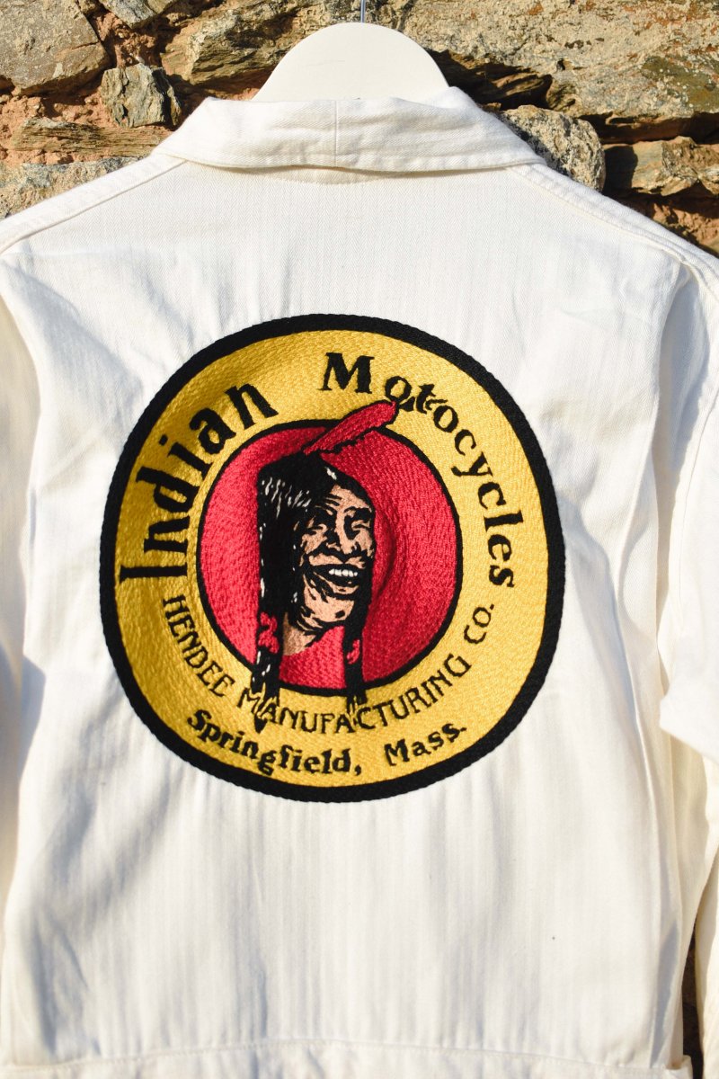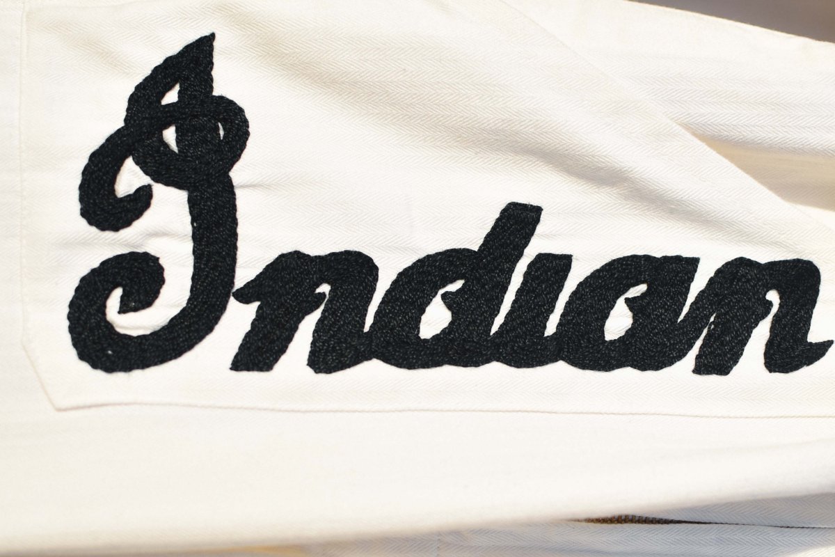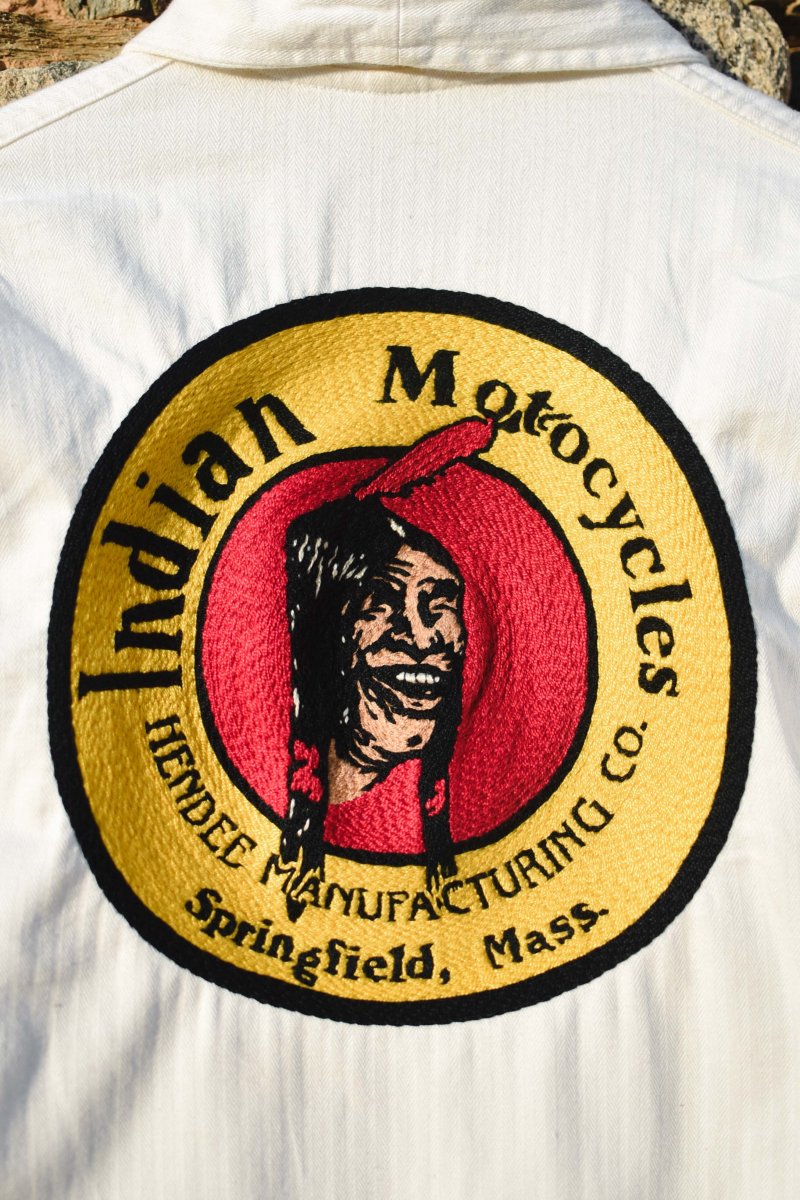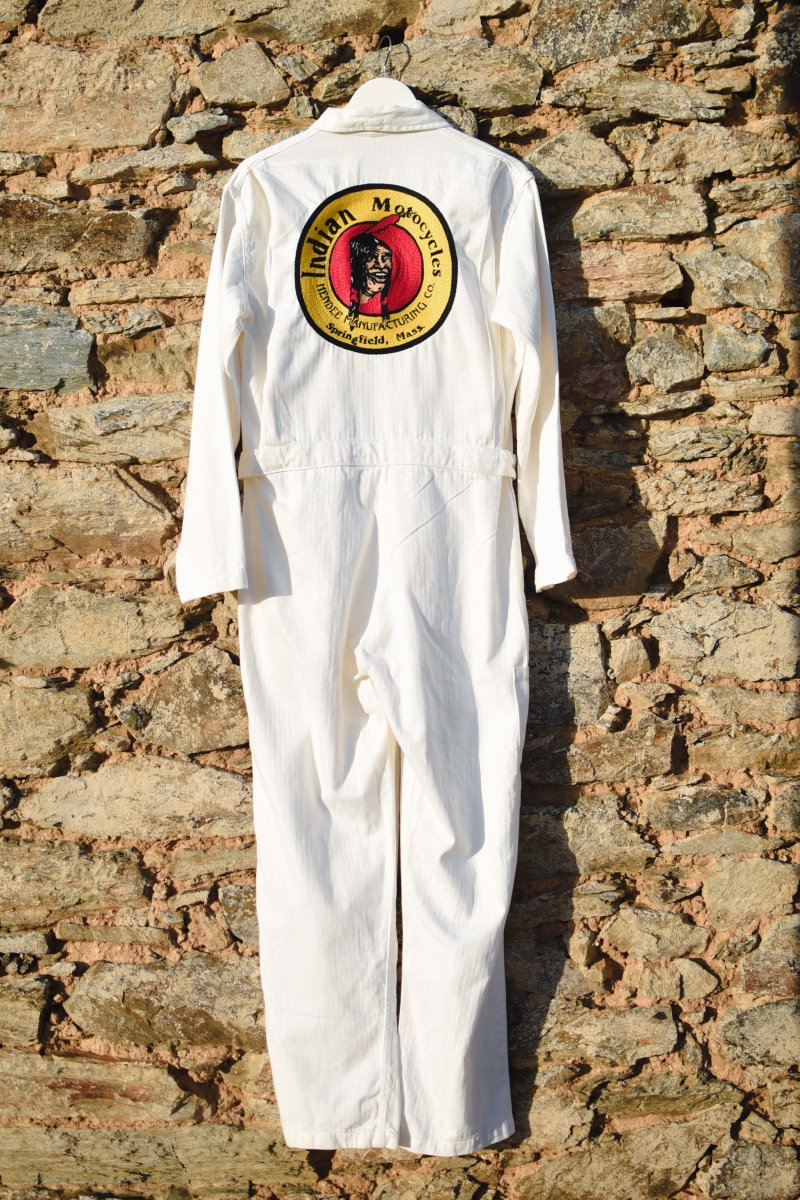 Combinaison neuve deadstock française en herringbone twill ou HBT des années 50 derrière nous y avons brodé à la main au pont de chaînette un des premiers logo d’Indian Motocycles dans l’année 1901. Plus de deux cent heures ont été nécessaires pour broder l’arrière et l’avant.