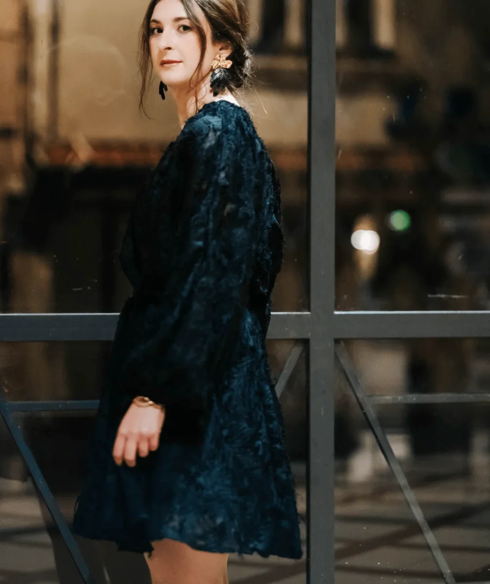 - Coupe : Fluide et légèrement évasée, manches longues bouffantes, décolleté en V