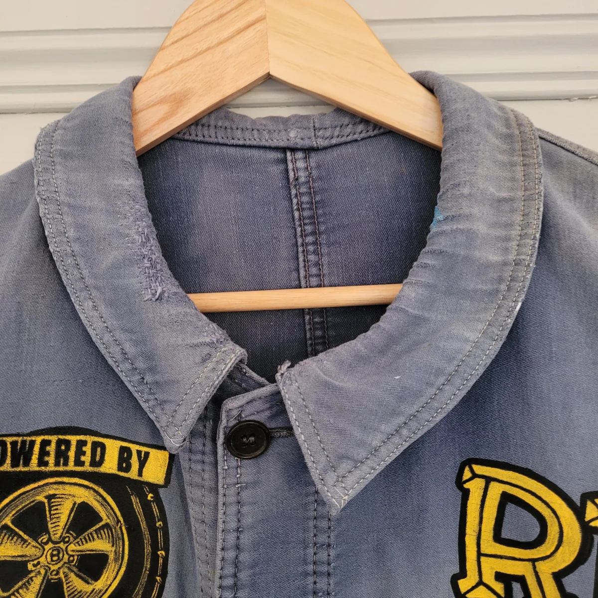 Veste de travail en moleskine française vintage 1950 avec usures et patine du temps .Nous avons réalisé une peinture dorsale faite à la main dans notre Atelier /Showroom par Sanette sur un thème de Ed « Big Daddy » Roth, thème sur le surf et les hot rod des 60’s et 70’s . Nous avons ajouté quelques patchs et badges fabriqués par nos soins . Une pure pièce made in France . À vous de continuer l’histoire…. au Born Free, au Wheels and Waves ou au Mooneyes show par exemple.