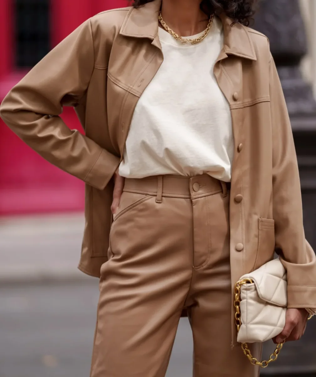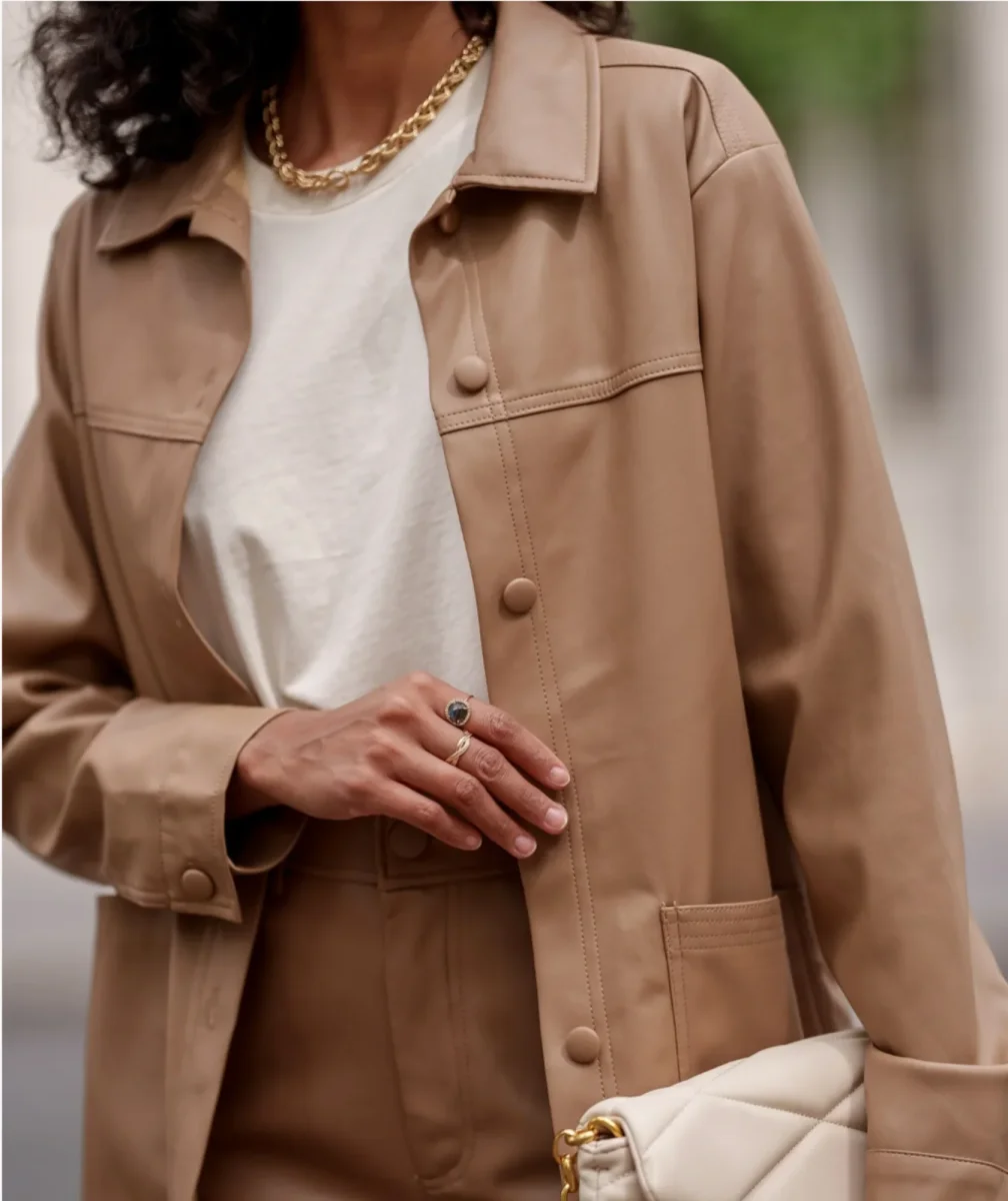 Conseil mode : Pour un look sophistiqué, associez cette veste droite en simili cuir camel avec un pantalon droit assorti ou un jean slim noir pour un joli contraste. Portez-la avec un t-shirt blanc basique pour un look épuré et moderne. Ajoutez des bottines en cuir ou des baskets blanches pour parfaire votre tenue. Accessoirisez avec un sac à main et des bijoux dorés pour une touche d’élégance supplémentaire.