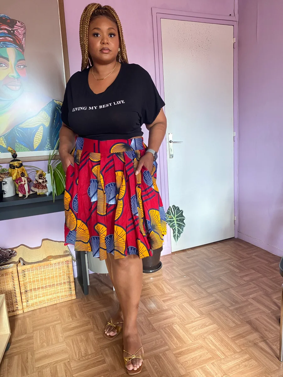 Jupe patineuse grande taille en Wax. Ceinture élastique dans le dos qui s’adapte à votre morphologie. Fini la ceinture qui serre lorsqu’on s’assoit. Poches intérieures. Longueur totale de la jupe : 57 cm Composition 100% coton en Wax véritable. Lavable en machine à 30° ou à la main. Repasser à l’envers. Questions et informations diverses […]