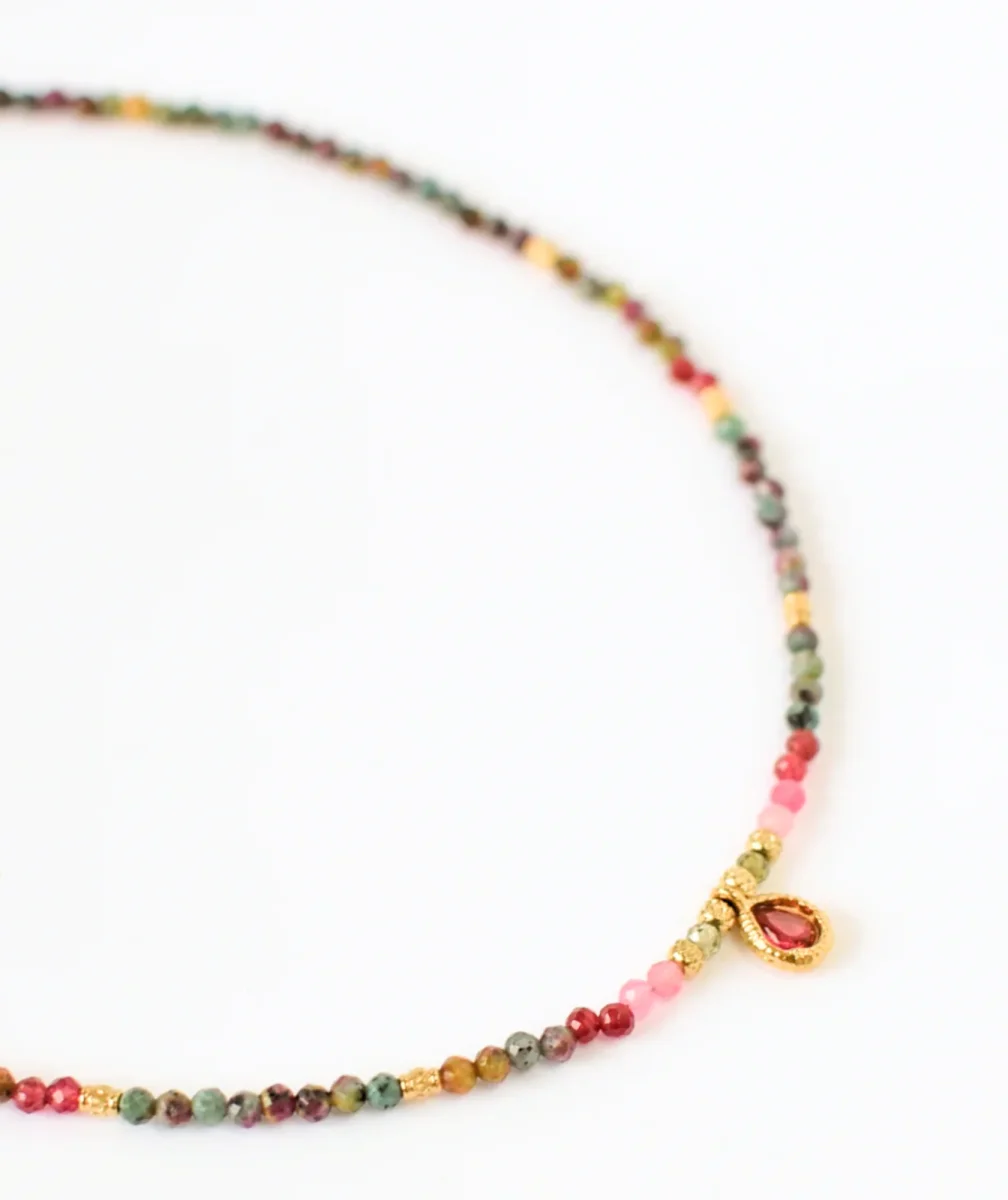 Ce collier en pierres multicolores apporte une touche vibrante et délicate à votre tenue. Ses petites perles aux nuances naturelles sont sublimées par un pendentif doré serti d’une pierre rose pour une finition élégante.