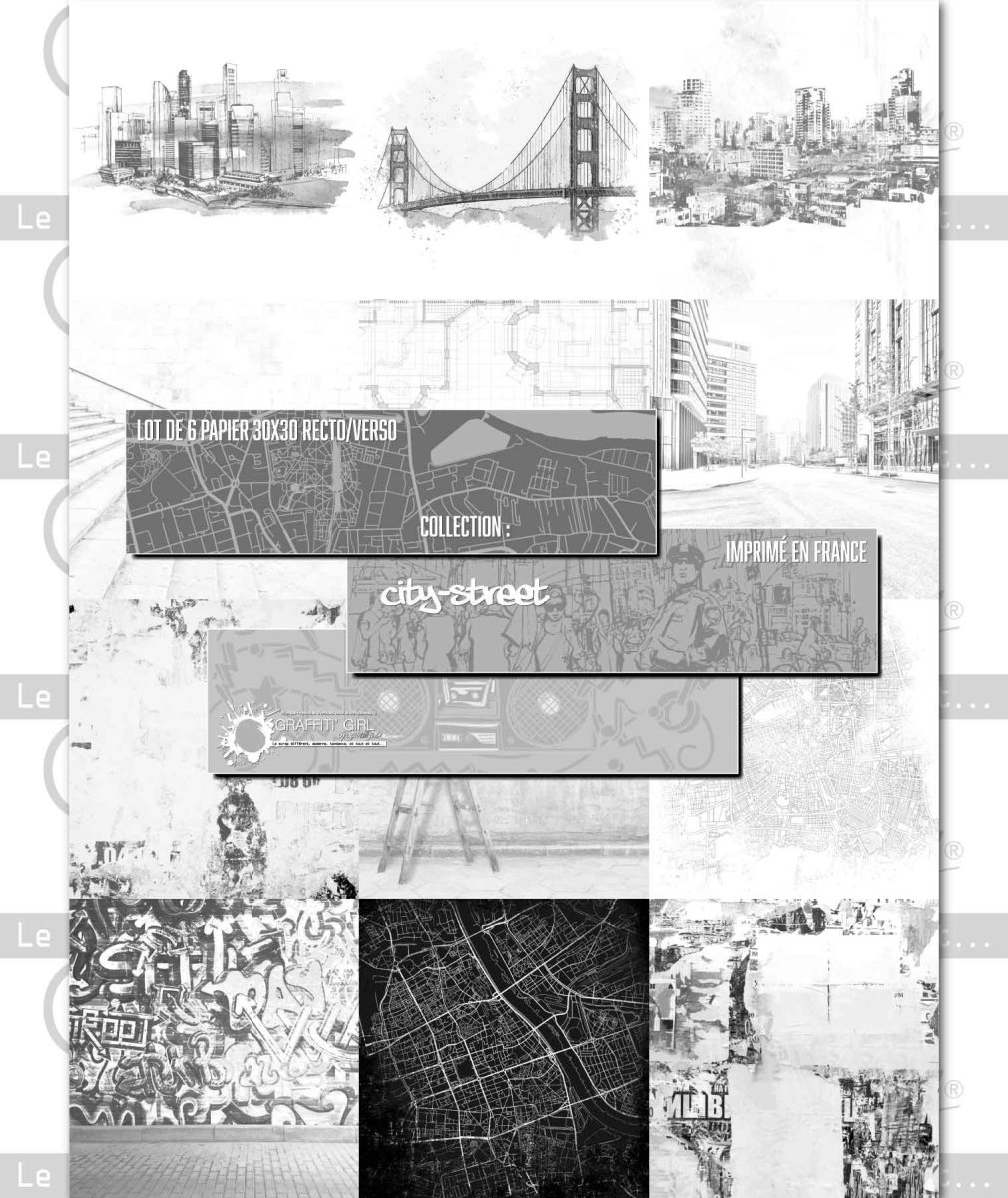 Un kit de 6 papiers scrapbooking 30×30, avec des motifs urbains, street art, assortis à la collection City Street.