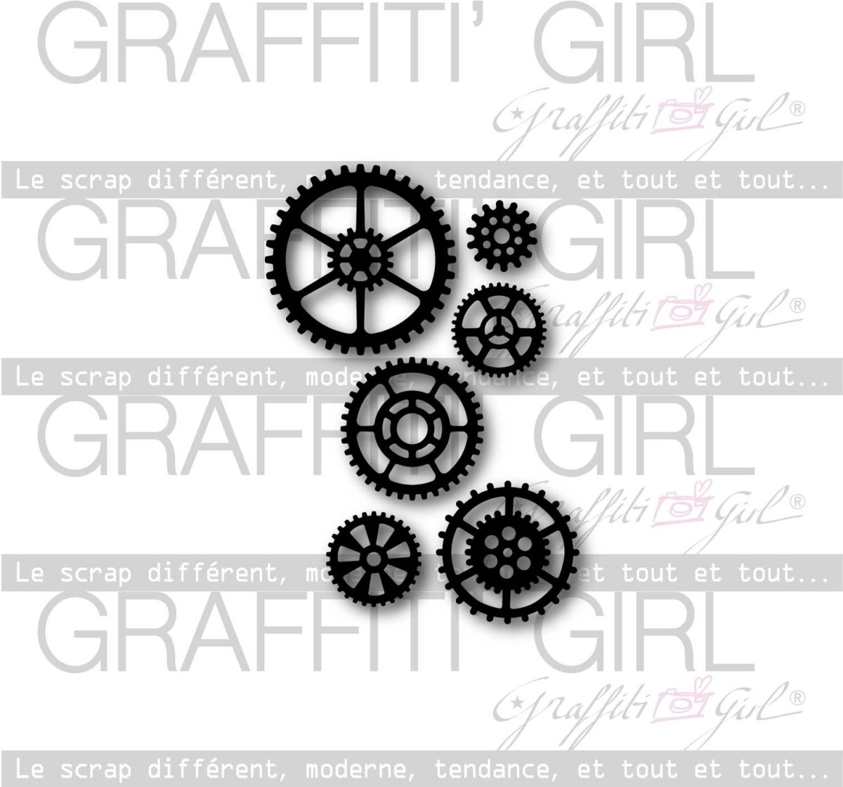 Nom: Rouages Produit: Dies, matrice de découpe Mots: Shooting, Album, Moment Taille: Le plus grand 4cm de diamètre, le plus petit 1,5cm Marque: Graffiti Girl Collection: Au masculin Le petit plus: Vendu dans une pochette papier kraft recyclé, A7. Utilisation: Convient à la plupart des machines de découpe sur le marché, (Big Shot, Cuttlebug, ect…) Shooting, moment, album