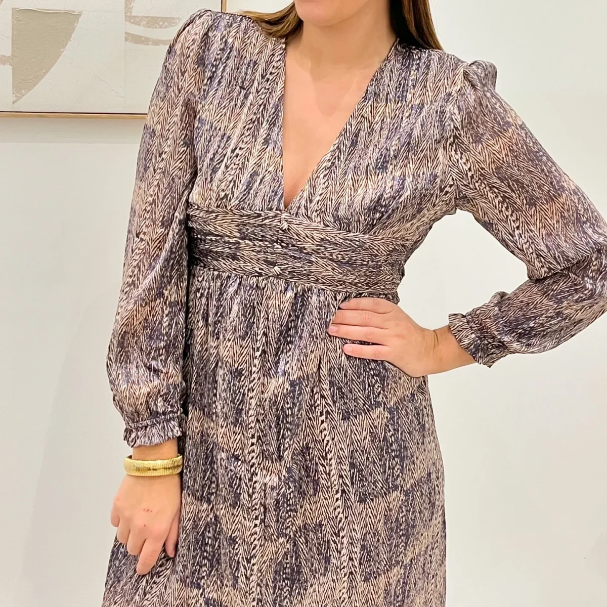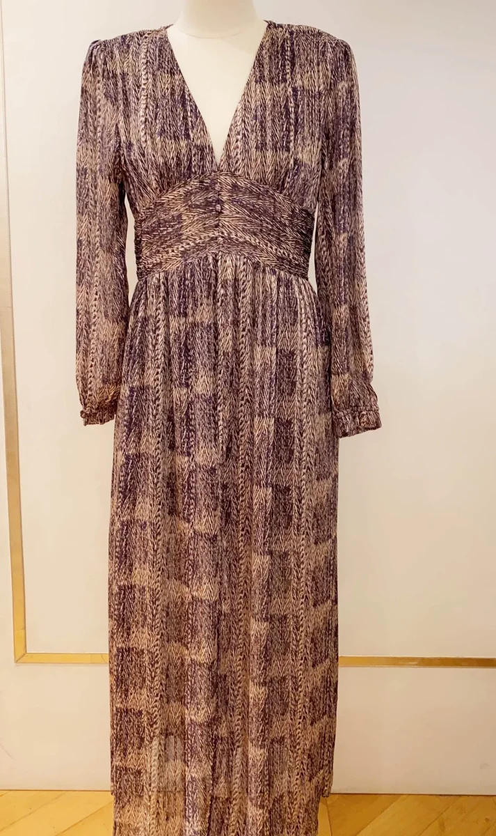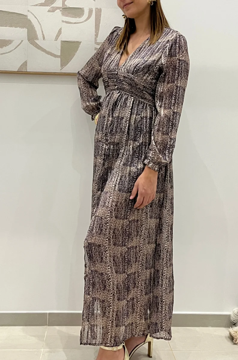 Le tissu imprimé présente un motif graphique subtil, mélangeant des nuances de mauve et de marron pour une touche à la fois naturelle et contemporaine. Cintrée sous la poitrine, cette robe met en valeur la silhouette tout en offrant un confort optimal grâce à sa coupe évasée. Idéale pour les occasions spéciales ou pour un look chic au quotidien, cette robe est une pièce phare de la saison.
