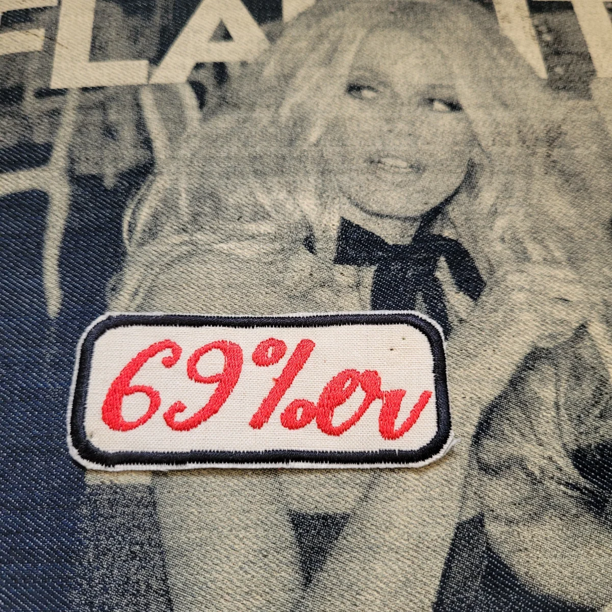 Patch brodé « 69%er » style club de motards années 60, en édition limitée, sur feutre et toile de coton vieilli. Dimensions : 7,6 cm x 2,5 cm.