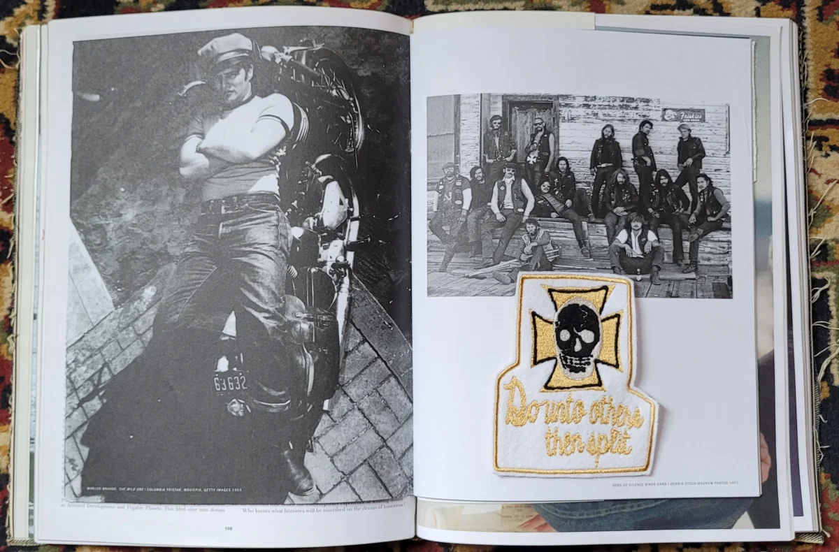 Limited embroidered patch « Do unto others then split », classic patch from 60’s california bikers on felt and old coton canvas. Size 4″×4″. My guideline is to keep alive the old fashioned way of embroidered patches with materials and defaults that make them unique pieces through the time. So you won’t find them anywhere else apart here as these designs aren’t sold on the web. I can do your proper patches from a good resolution pic. Ask me.