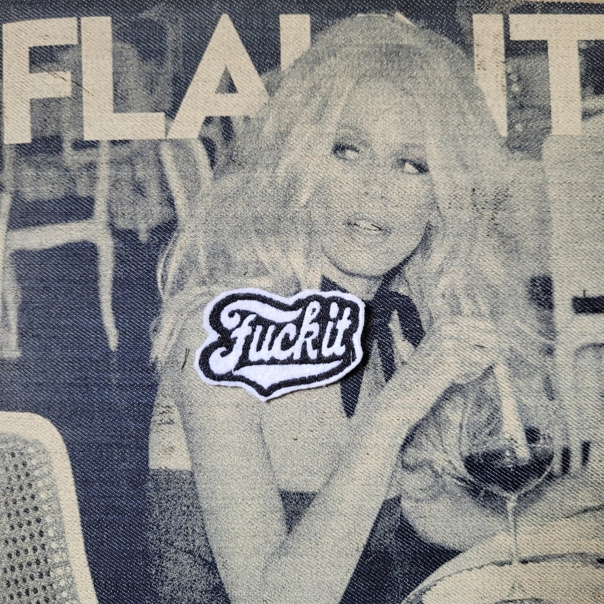 Patch brodé en série limitée « FUCK IT » sur feutrine doublée de vieux tissus cotons. Sa taille est de _8 cm x 4 cm