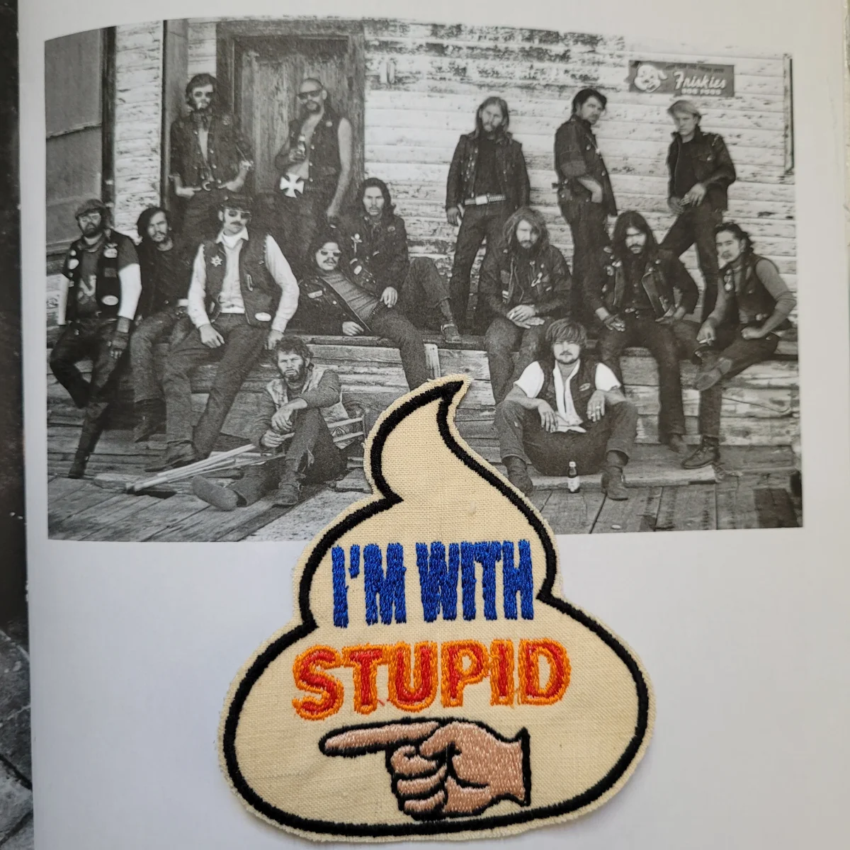 Patch brodé en série limitée « I’m with stupid » sur vieux tissus cotons. Entrez dans la famille mondiale des choppers freaks. Sa taille est de 11,5cm× 7cm Notre volonté est de faire perdurer l’amour du patch artisanal avec ses matières et ses défauts qui en font des pièces uniques qui traversent le temps. Vous serez ainsi sûr de ne jamais trouver les mêmes ailleurs comme mes designs sont souvent uniques en broderie. Je propose également de vous broder votre propre patch sur image de bonne qualité, renseignez vous.