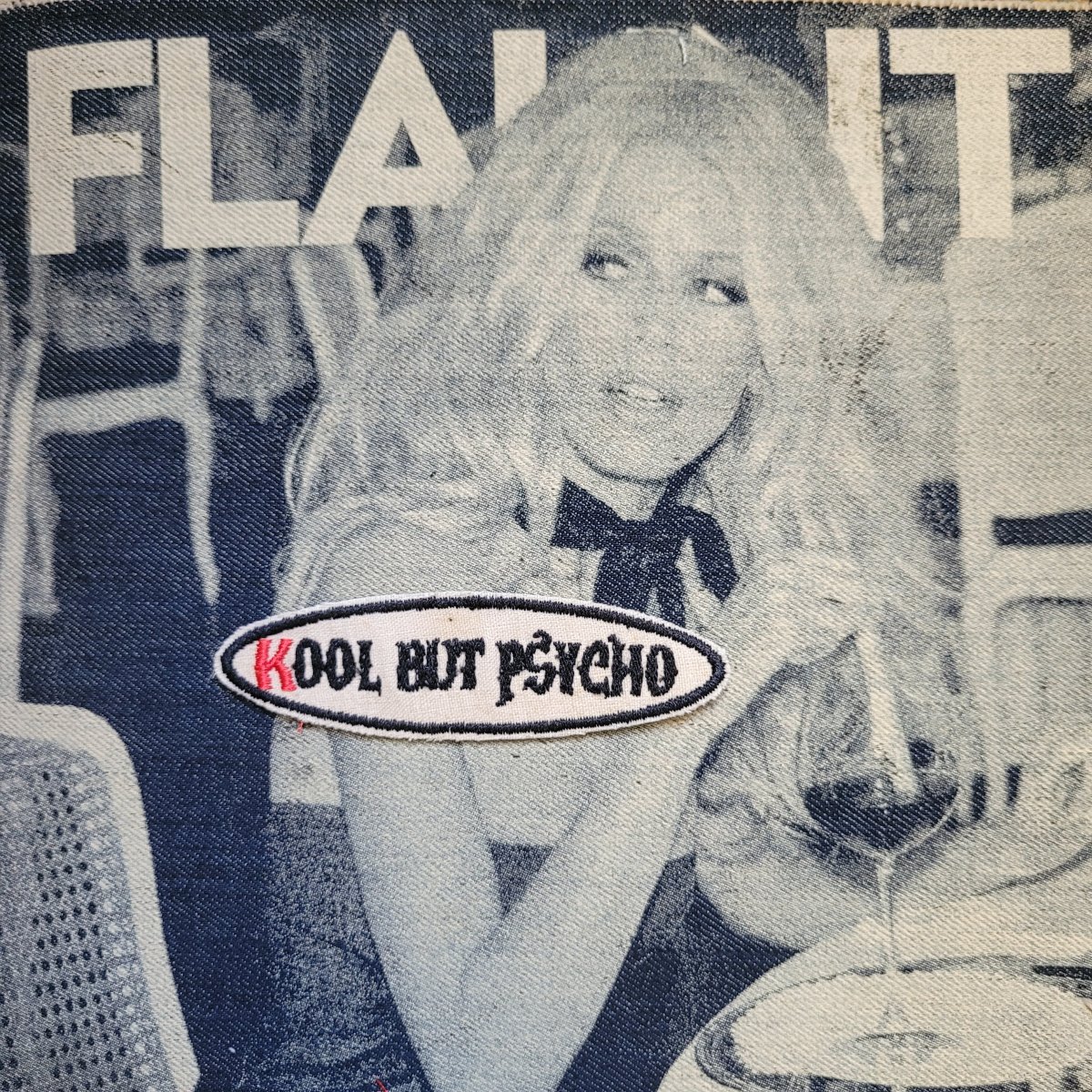 Patch brodé en série limitée « Kool but psycho » sur vieux tissus cotons. Sa taille est de 10 cm × 3 cm