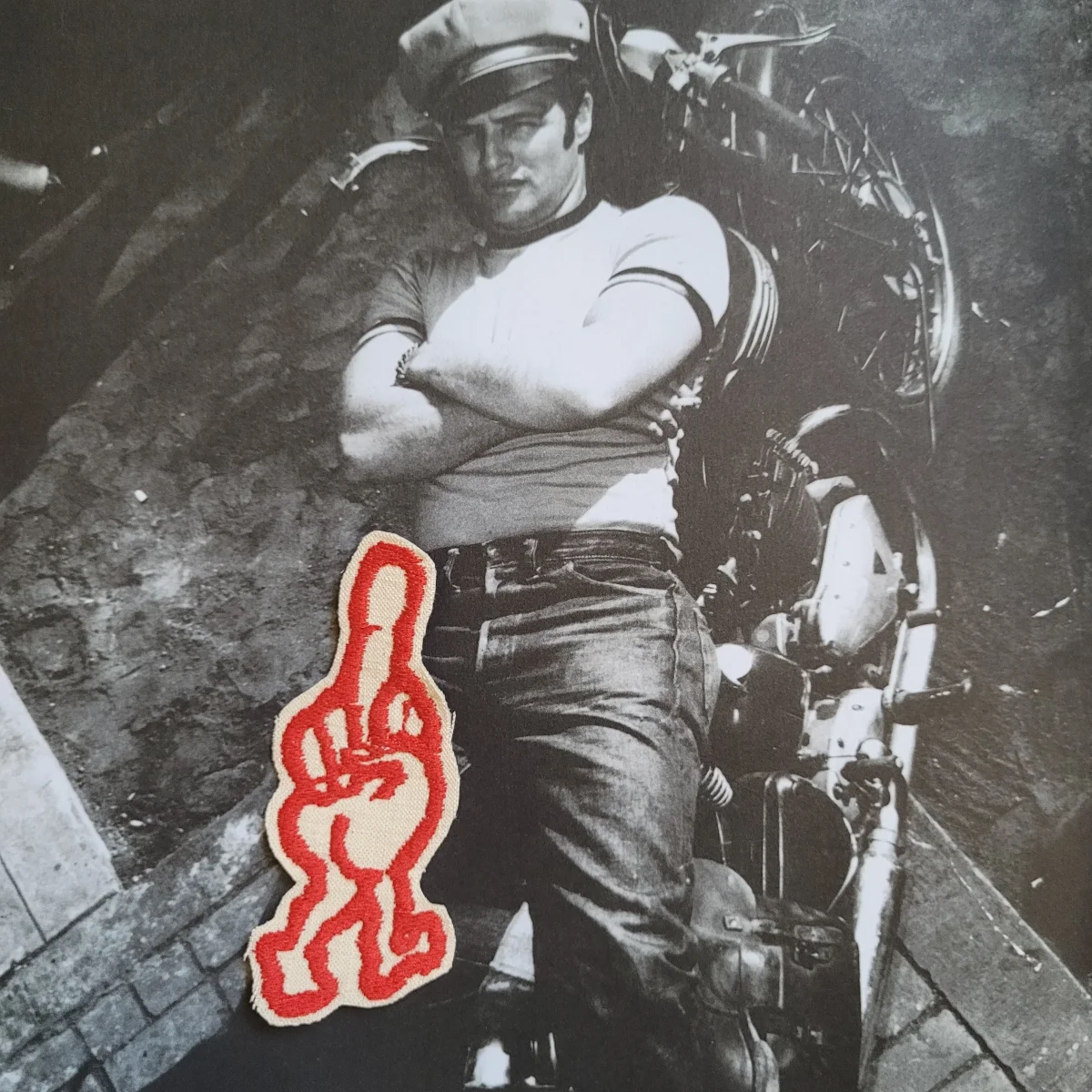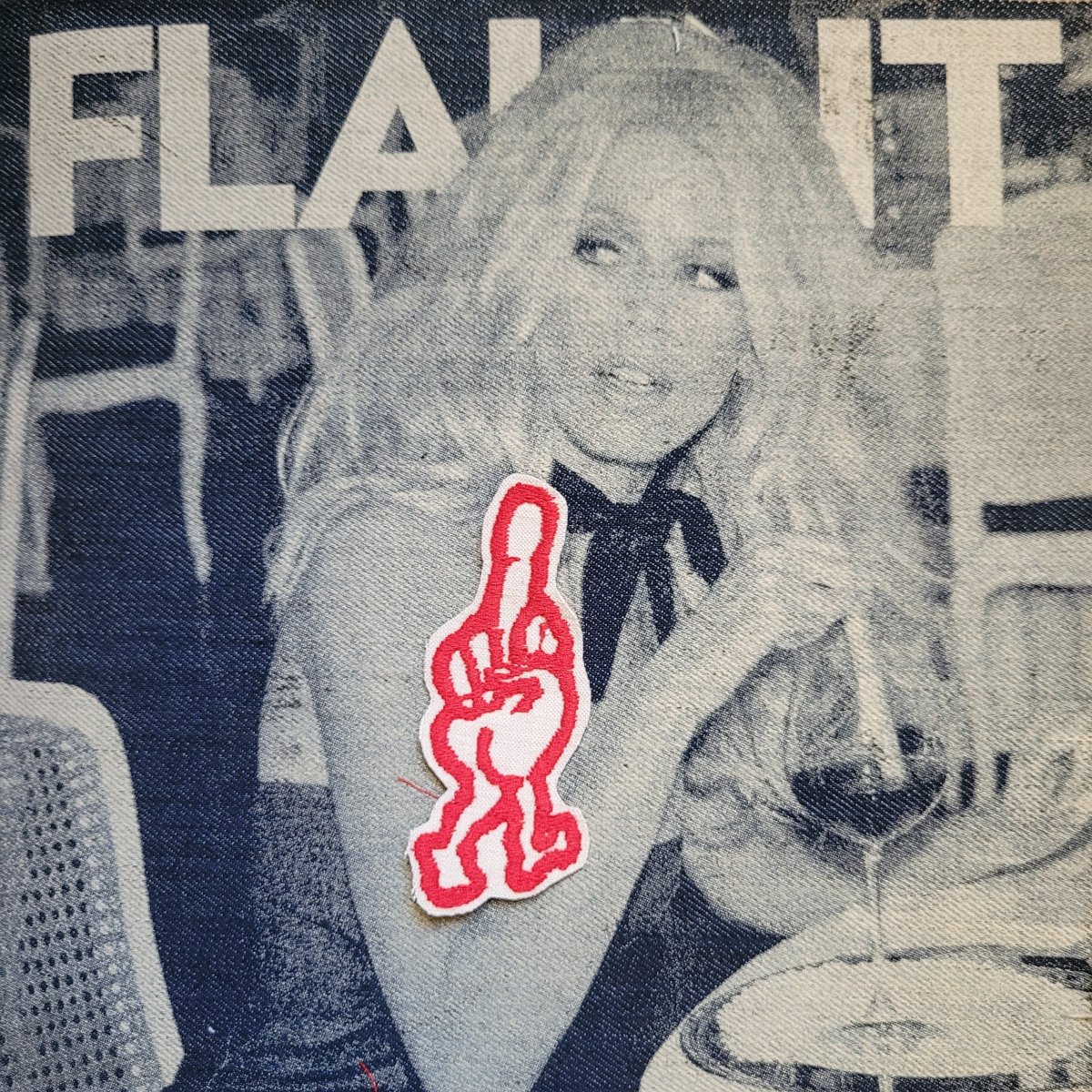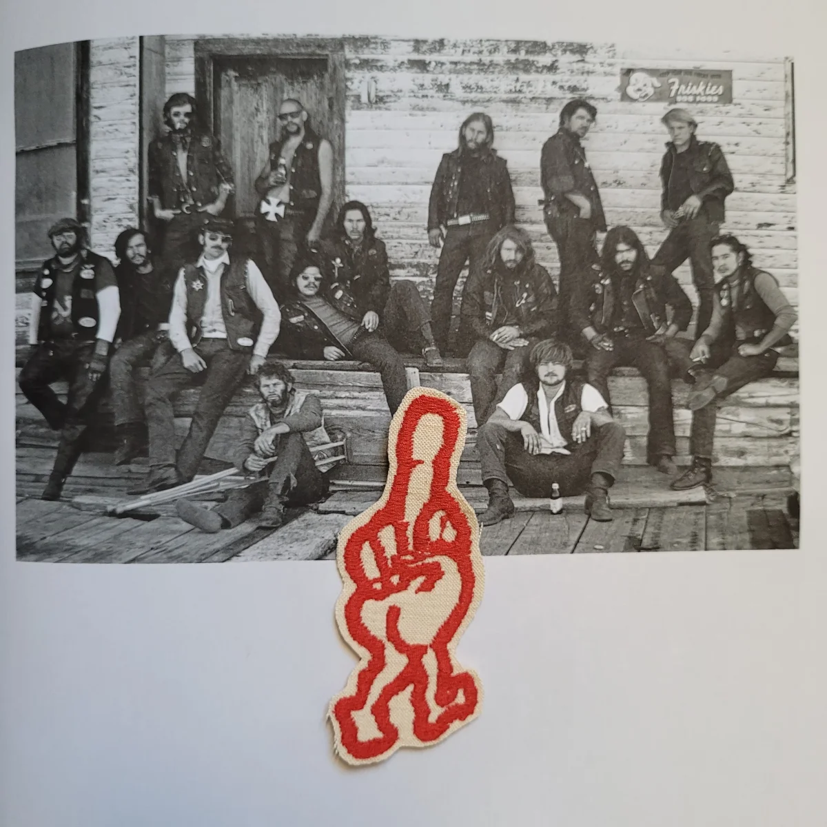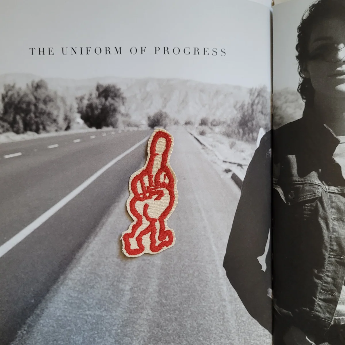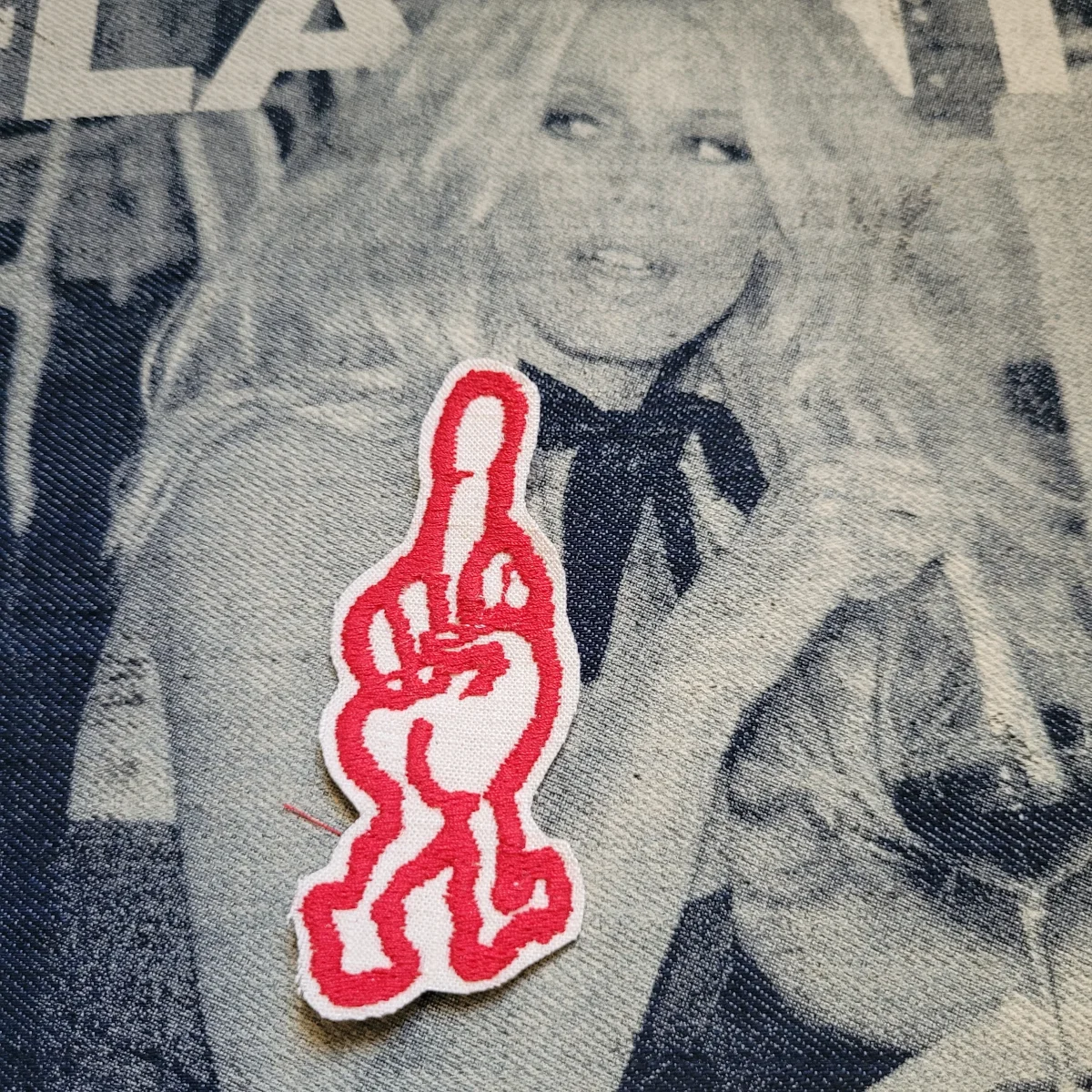 Écusson brodé en édition limitée « Doigt d’honneur marchant » sur toile de coton ancienne. Dimensions : 7,6 cm x 2,5 cm.