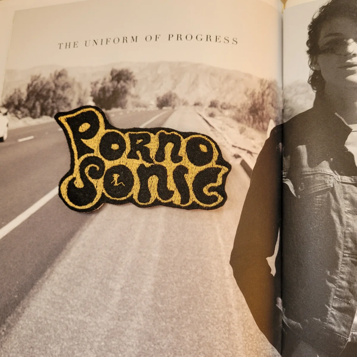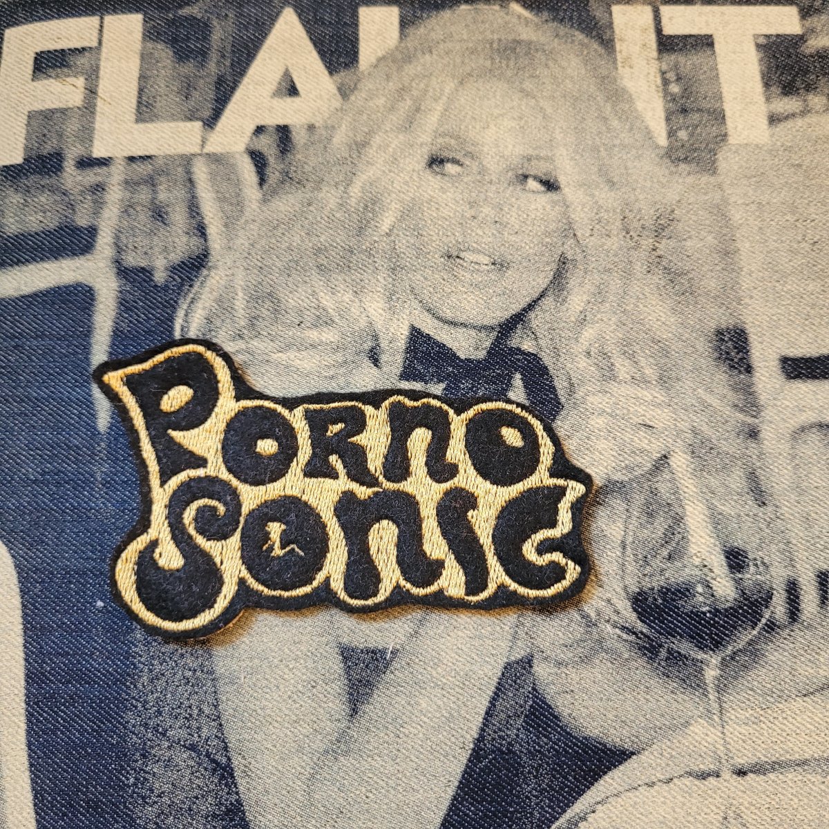 Limited embroidered patch « Porno Sonic » present in 3 colors on felt and old coton canvas.Manufacturing in our workshop. Size:4« ×2,5 »