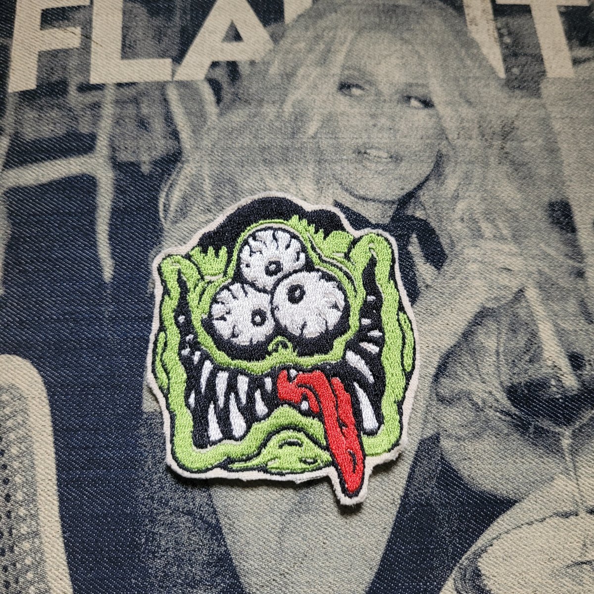 Patch brodé en série limitée « The Monster Psychedelic Weirdo  » sur vieux tissus cotons. Sa taille est diamètre 8,5cm×10cm.