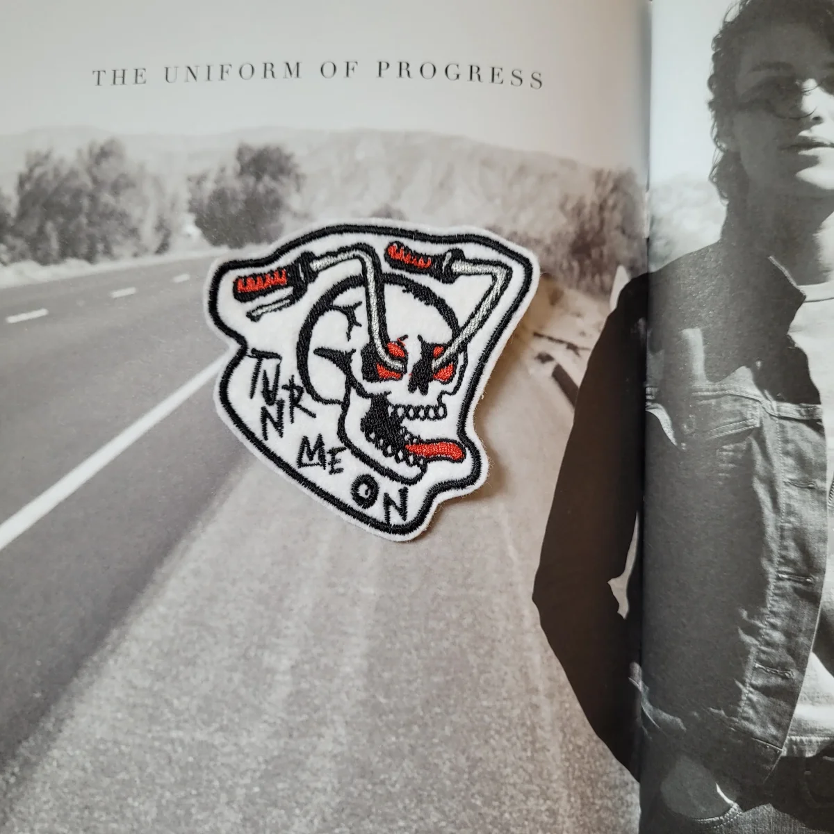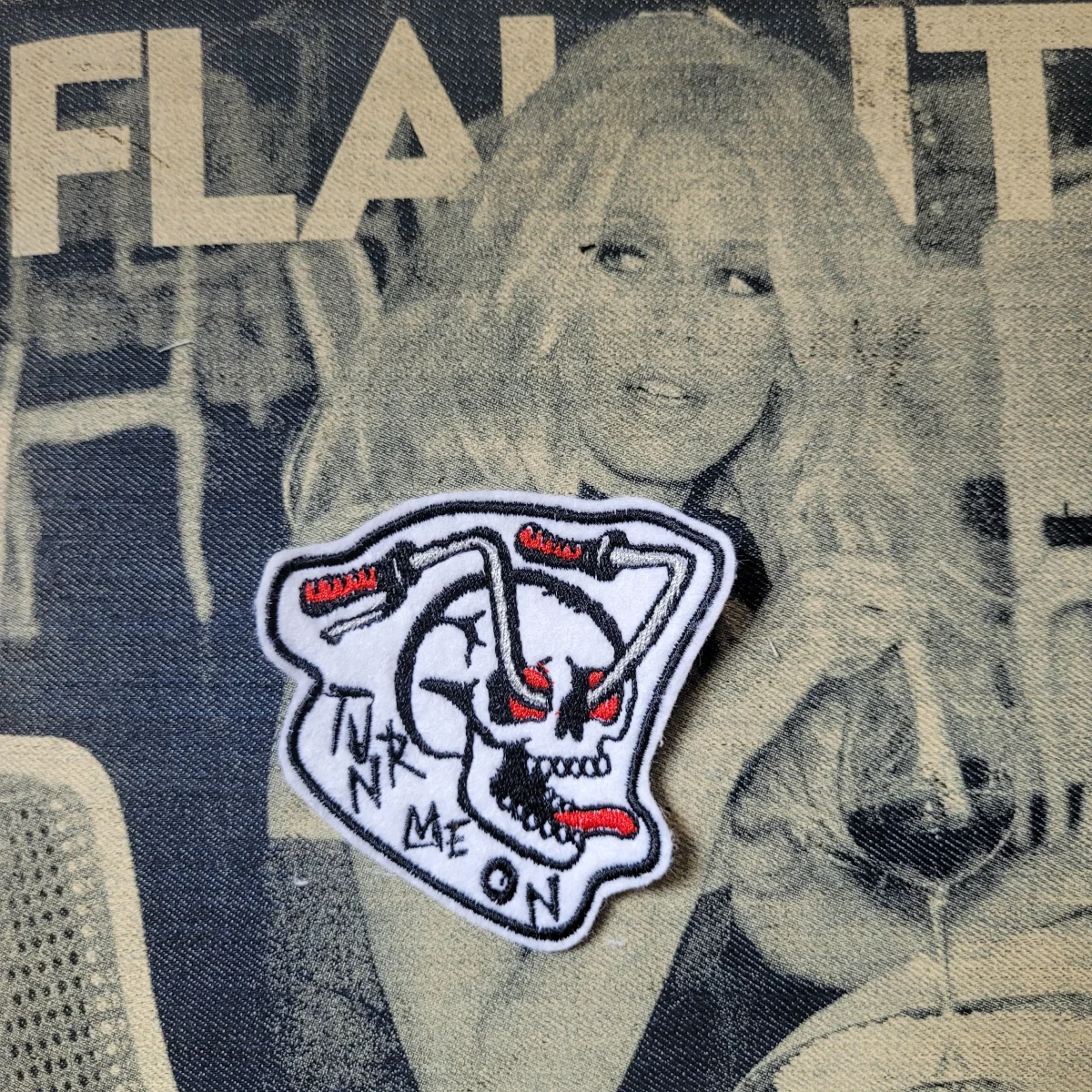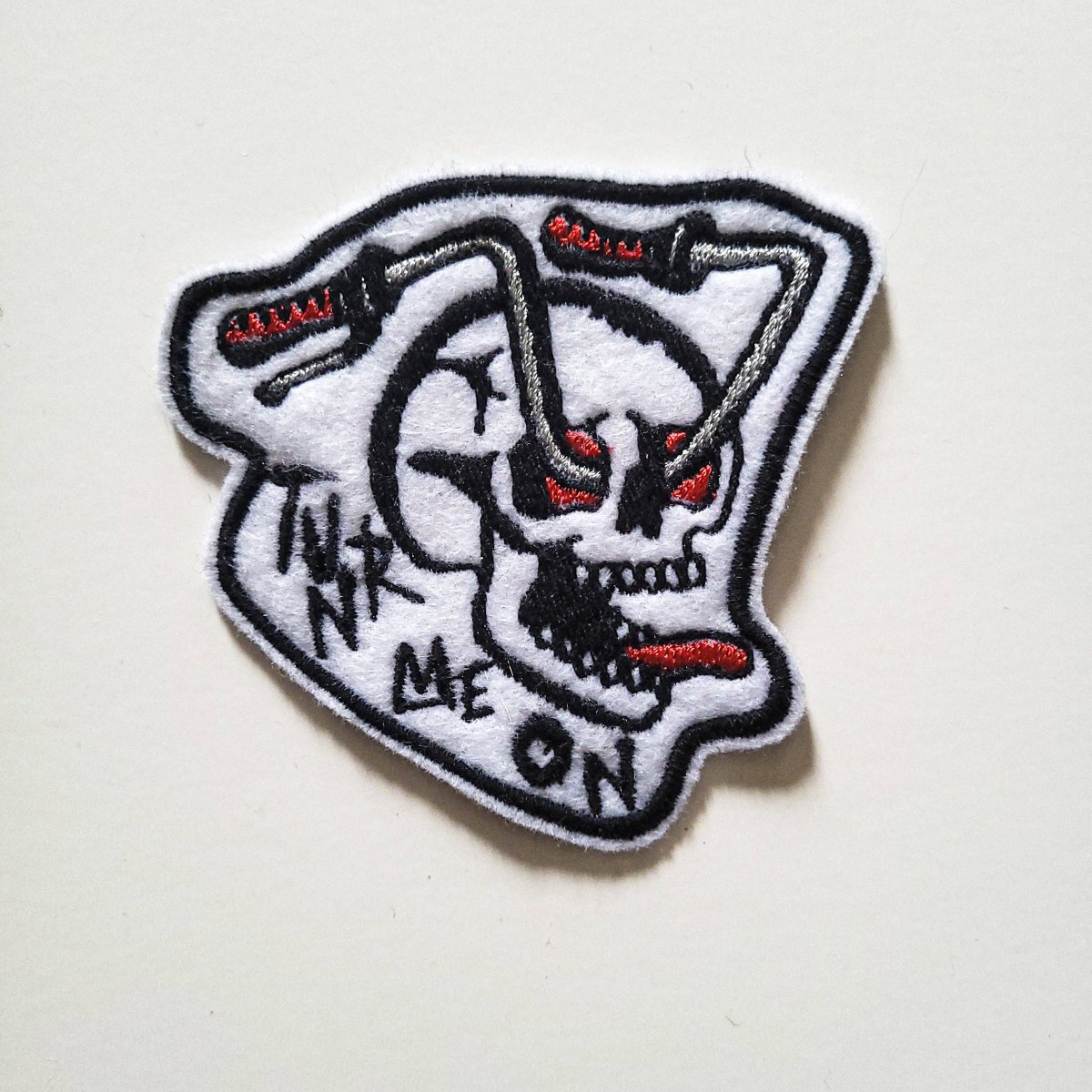 Patch brodé « Turn me on » « Guidon sur tête de mort » classique du chopper freak, sur feutrine doublée de vieux tissus cotons. Fais toi plaiz avec notre patch brodé biker année 60 ! Montre ta passion pour le guidon, le bikini et l’asphalte tout en gardant un côté rebelle et fun. Exprime ta philosophie de vie « à fond » sans prise de tête (ou sur ton chopper). Vivre maintenant, demain on verra. Sa taille est de 7cmx10cm
