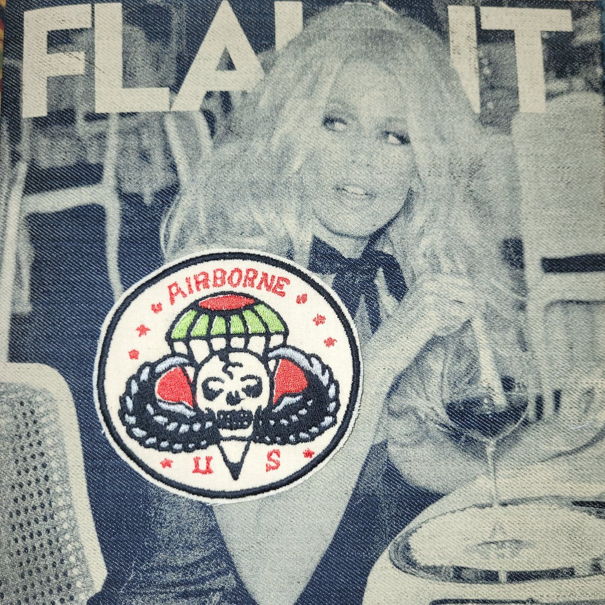 Limited series embroidered patch « US Paratroopers » with old cotton fabrics. Its size is 4″ × 4.5″