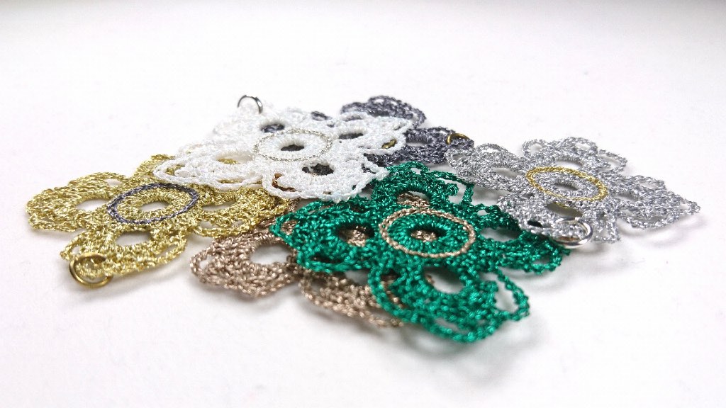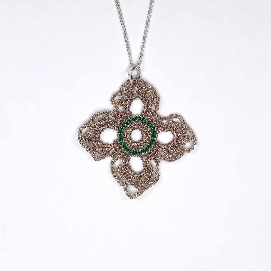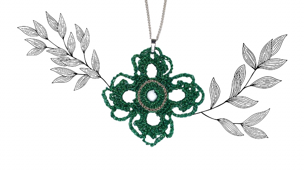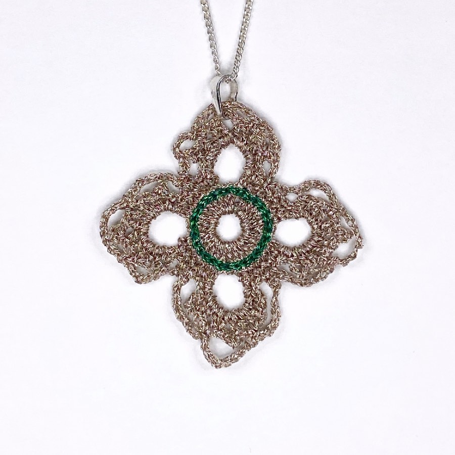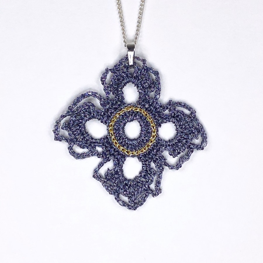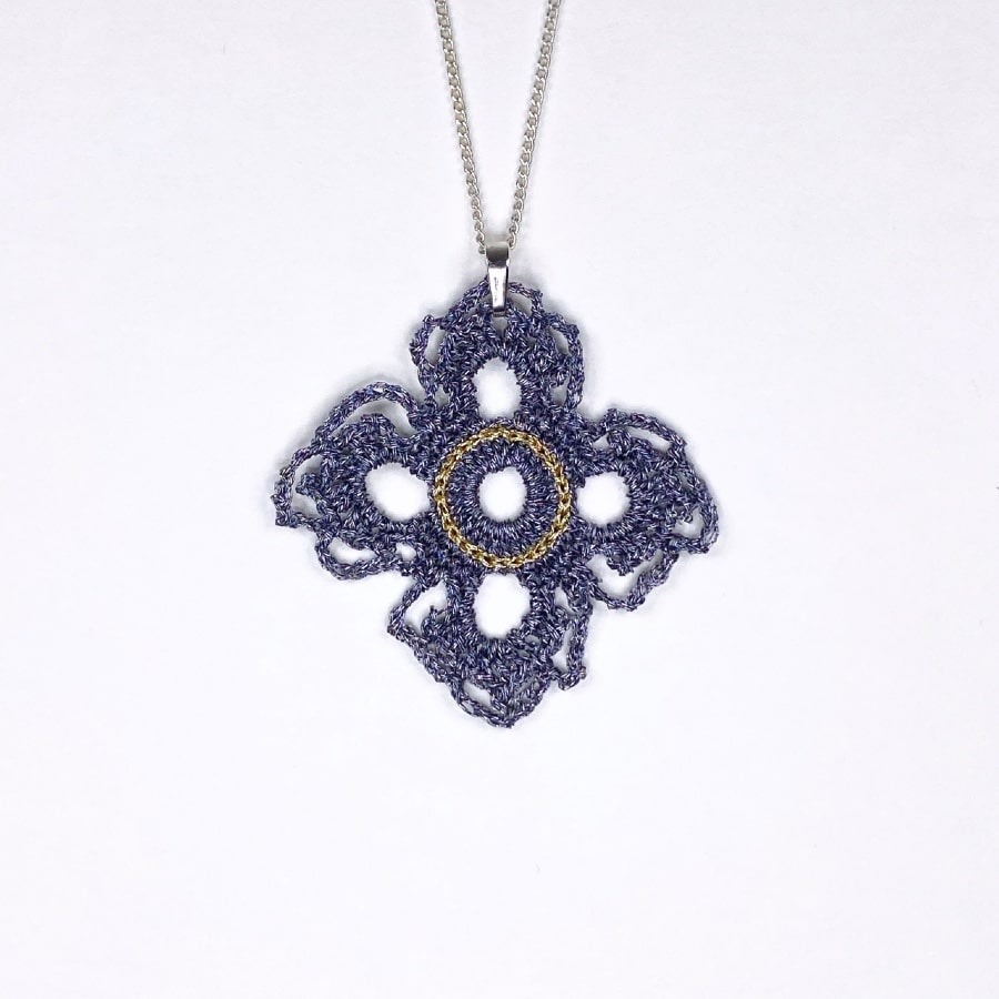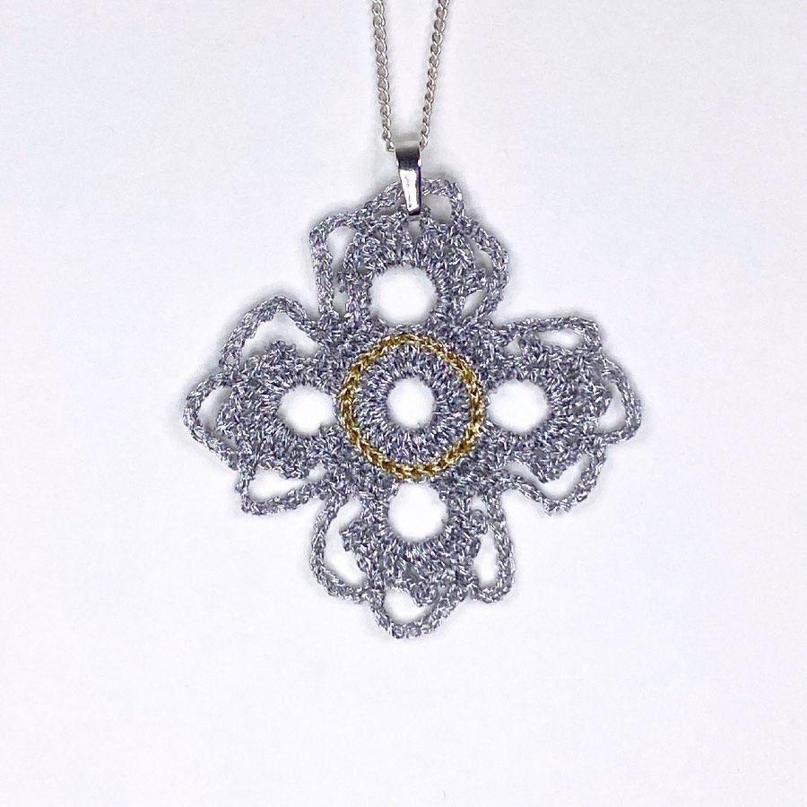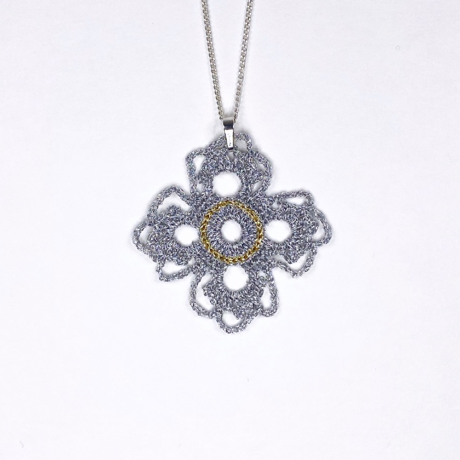 Dans les deux cas, ce pendentif en dentelle au crochet reste moderne par sa géométrie.