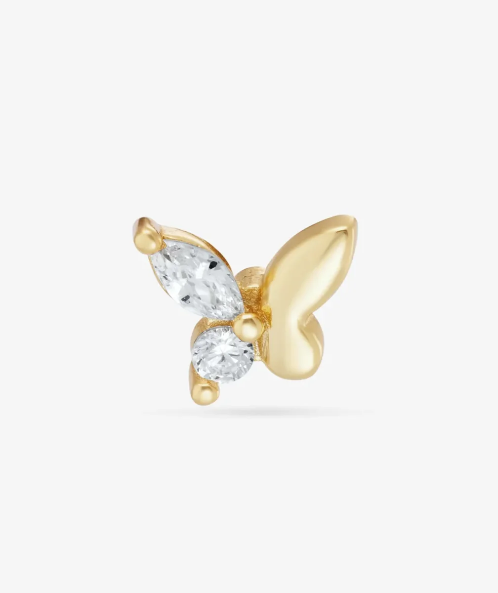 Laissez-vous envoûter par la finesse du piercing Julia Papillon de Nébuleuse Bijoux. Avec son motif délicat en forme de papillon, sublimé par des zircons scintillants, ce bijou exprime légèreté et raffinement. Son design intemporel s’adapte parfaitement au lobe et au cartilage grâce à sa barre de 6 mm et son diamètre de 1,2 mm.
