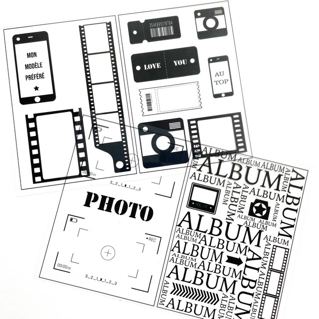 Quatre A6 aux designs différents, transparents, noirs, thème photo