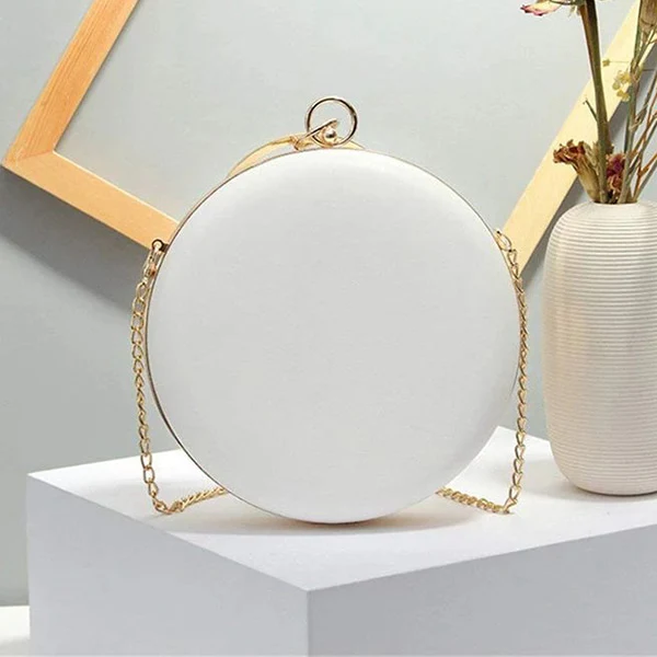 Ce qui attire notre regard ? Sa forme ronde et sa bandoulière en chaîne dorée. Elle peut également être portée main grâce à son anneau anse avec strass. Enfin, avec sa structure rigide, elle peut contenir vos affaires les plus précieuses sans risquer de les déformer.