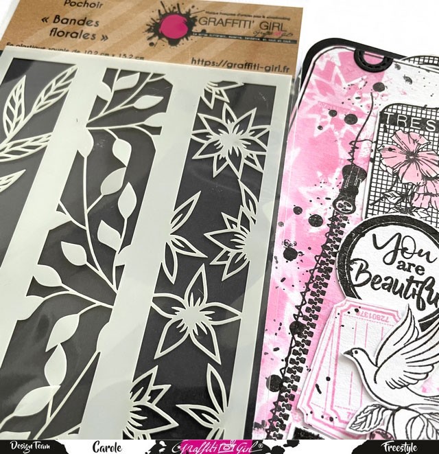 Nom: Bandes florales Produit: Pochoir en plastique souple Taille: 10,2 x 15,2 cm Marque: Graffiti Girl Collection: Cocon Le petit plus: Parfait avec une utilisation de la modeling paste Utilisation: Idéal pour travailler vos fond de pages, peut être utilisé avec de l’encre, de la craie, peinture ou spray, ou encore des pâtes de structures..