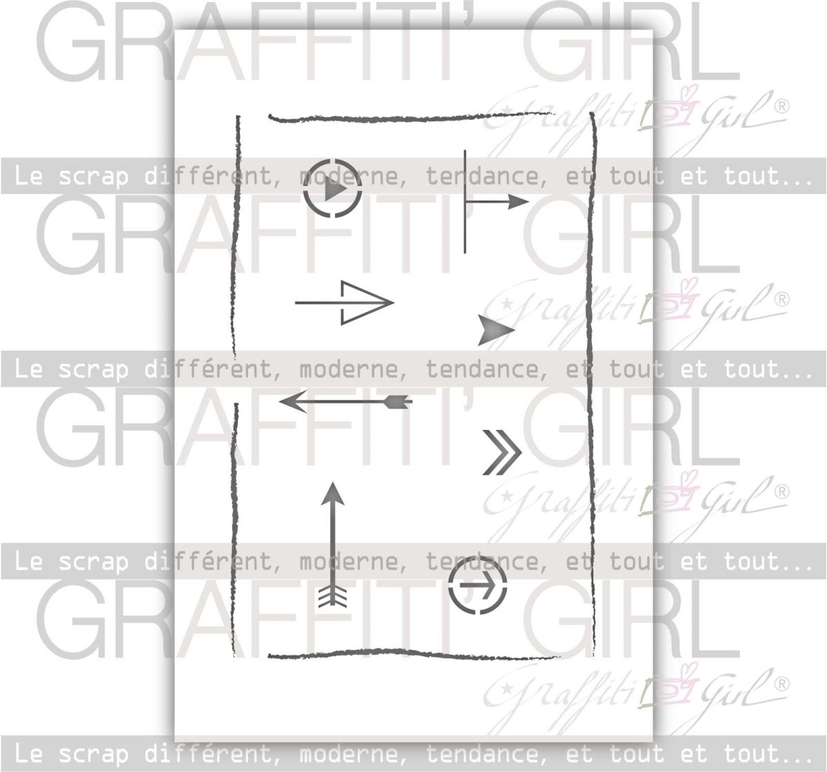 Ce pochoir scrap Flèches à gogo de chez Graffiti Girl appartient à la collection Géomavie. Ce pochoir graphique dispose de toutes sortes de flèches, mais également un cadre pour entourer vos photos par exemple, ou encadrer vos pages de scrap, à utiliser avec divers matières de beaux-art. Très apprécié dans l’univers du mixed-media et de l’art journal.