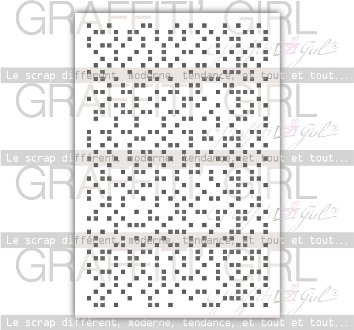 Nom: Pixel Produit: Pochoir en plastique souple Taille: 10,2 x 15,2 cm Marque: Graffiti Girl Collection: Au Masculin Le petit plus: Parfait avec une utilisation de la modeling paste Utilisation: Idéal pour travailler vos fond de pages, peut être utilisé avec de l’encre, de la craie, peinture ou spray, ou encore des pâtes de structures..