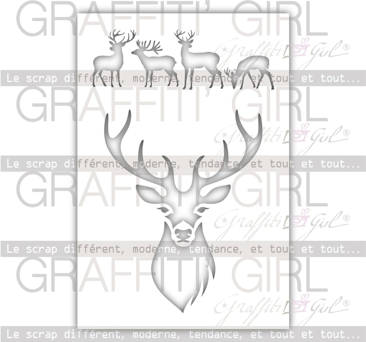 Pochoir semi souple avec de jolis motifs de rennes, un design façon paysage, et un motif avec un gros renne.
