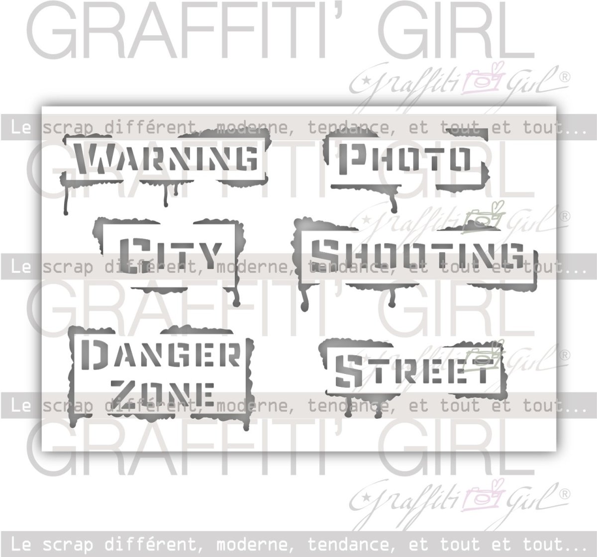 Nom: Street Produit: Pochoir en plastique souple Taille: 10,2 x 15,2 cm Marque: Graffiti Girl Le petit plus: Parfait avec une utilisation de la modeling paste Utilisation: Idéal pour travailler vos fond de pages, peut être utilisé avec de l’encre, de la craie, peinture ou spray, ou encore des pâtes de structures..