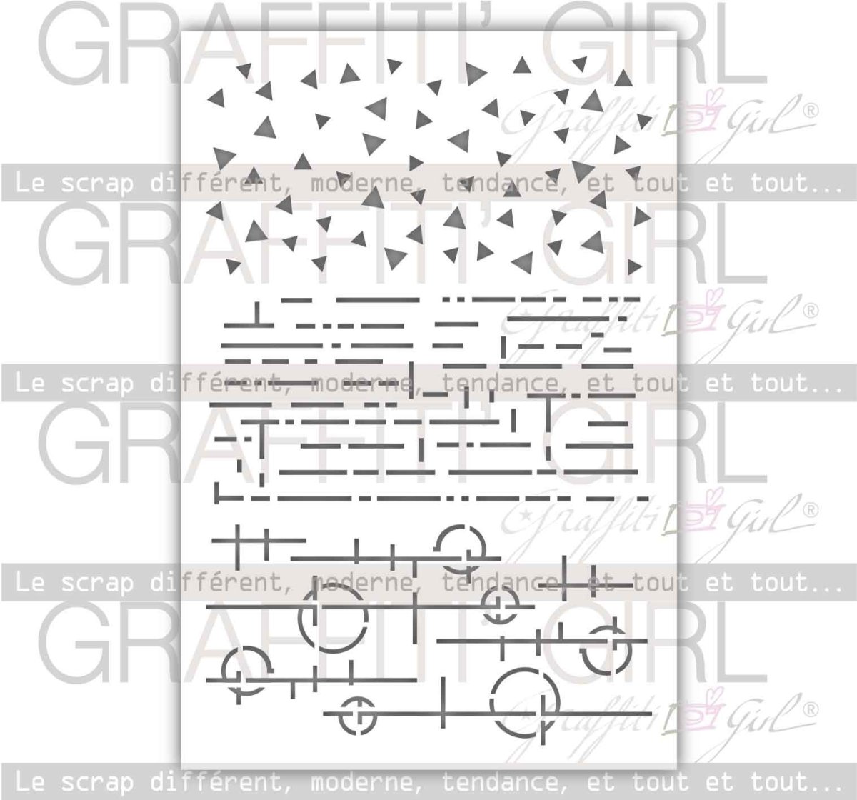 Ce pochoir en plastique de chez Graffiti Girl appartient à la collection Coup de soleil. Ce pochoir texture vous propose une gamme de dessins tels que les triangles, des traits avec des cercles, un peu de modernité. Tout cela dans un esprit graphique et géométrique pour vos créations de scrapbooking. Très apprécié dans l’univers du mixed-media et de l’art journal.