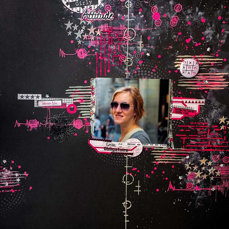 Voici une toile de scrap en triangle avec utilisation du pochoir texture en haut en bas, réalisée par l’équipe Graffiti Girl. Pour la découvrir, cliquez ci-dessous :