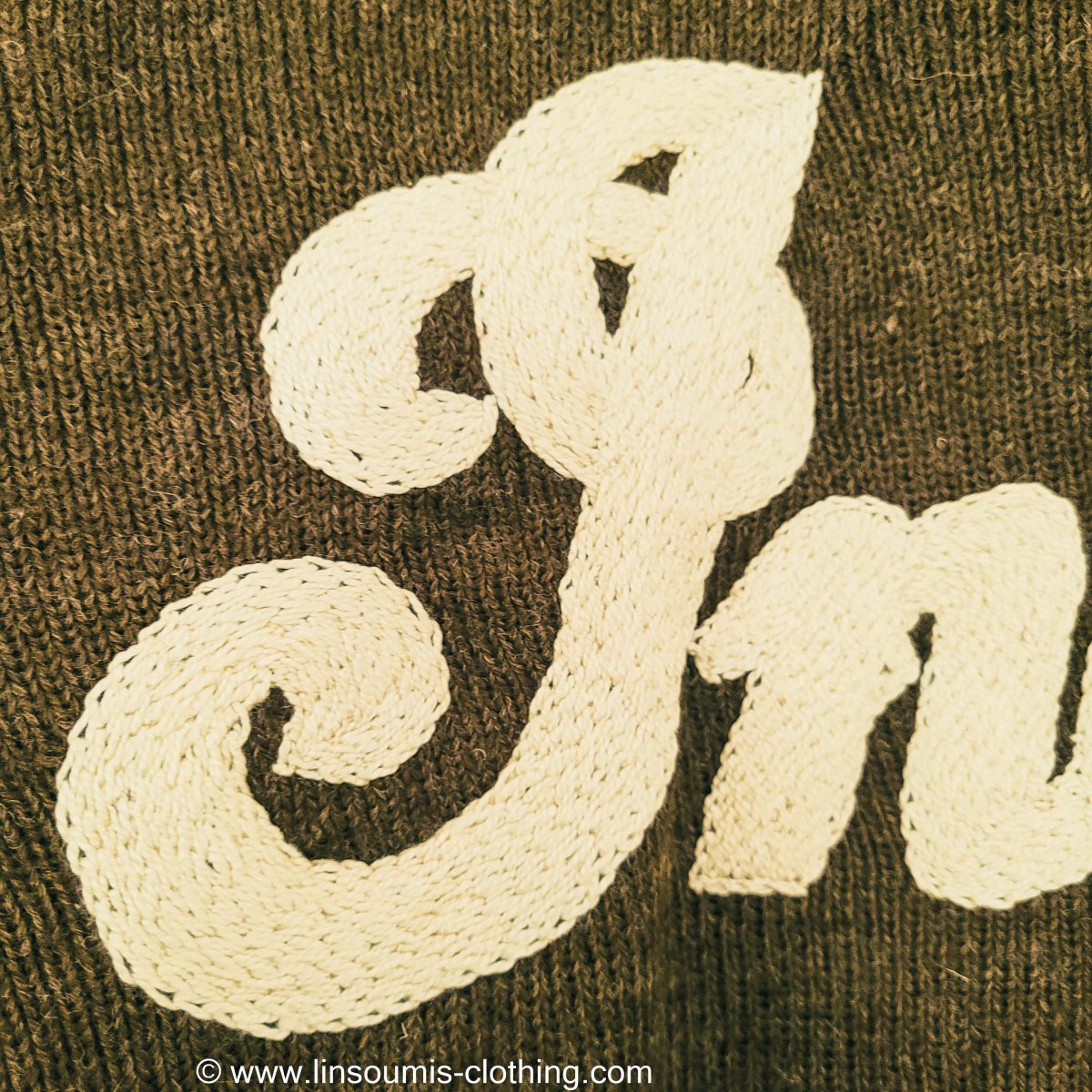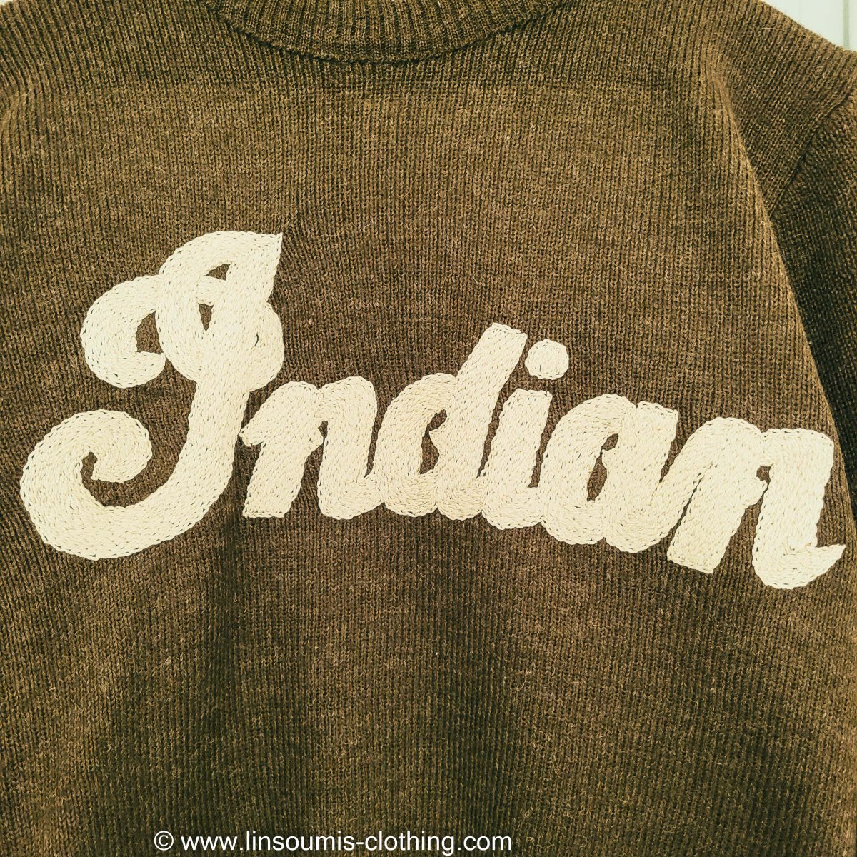 Rare deadstock jersey en laine daté 1949 sur lequel nous y avons brodé à la main au point de chaînette le logo d’Indian Motocycles. Plus de cent heures ont été nécessaires pour broder l’avant.
