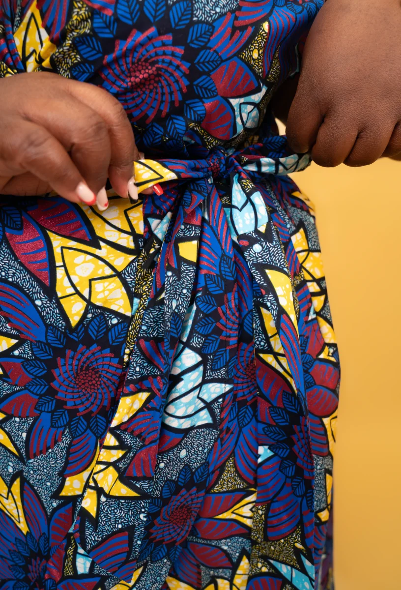 Robe courte au-dessus du genou (100-105 cm), coupe trapèze avec décolleté graphique. Sans fente. Taille élastiquée dans le dos, ceinture à nouer, poches intérieures.100 % coton Wax véritable. Lavage à 30° ou à la main, repassage à l’envers.Précommande – confectionnée à Cotonou (Bénin).Livraison offerte dans le monde sous 5 à 7 semaines.Aussi disponible en longueur […]