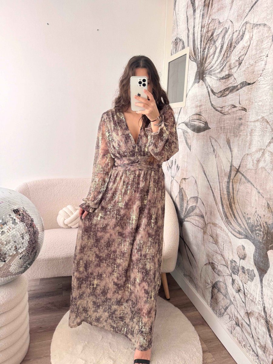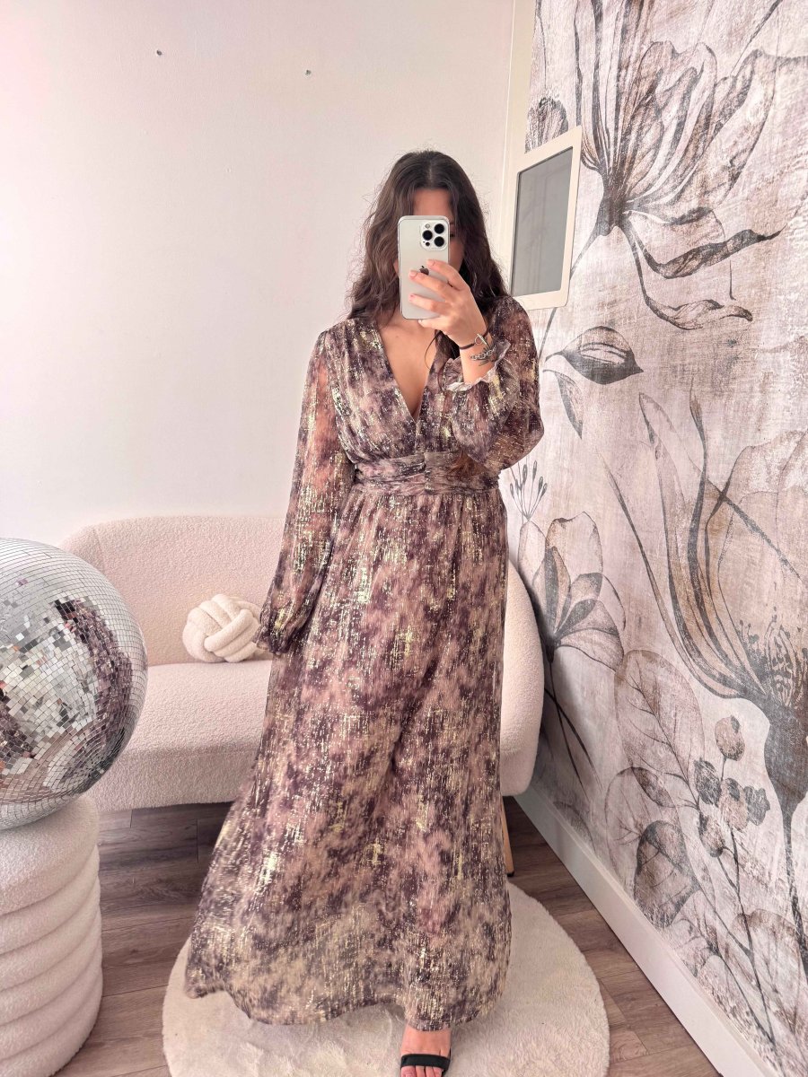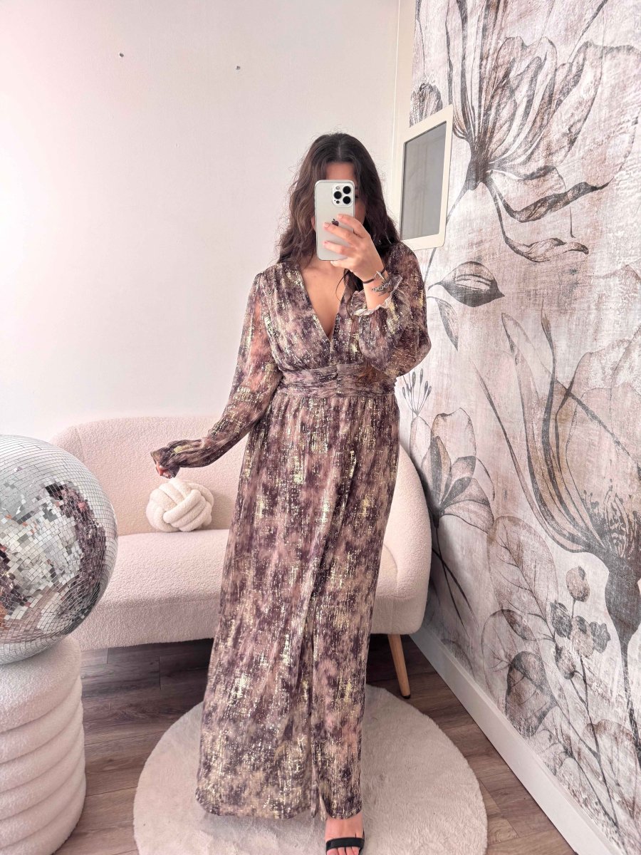 • Robe longue doré • Mauve/doré • Doublure dessous ( pas transparent) • Taille: Du S au 4XL • 60% polyester 40% viscose • Made in China