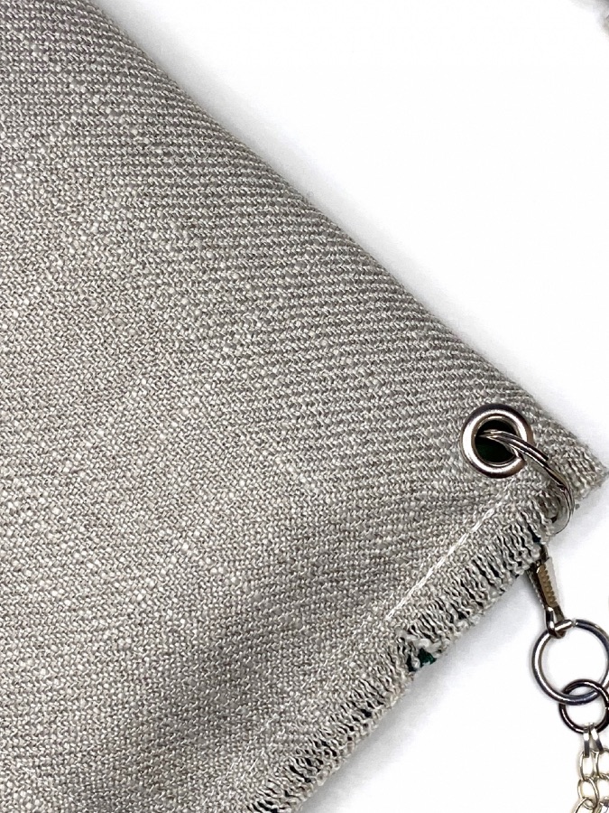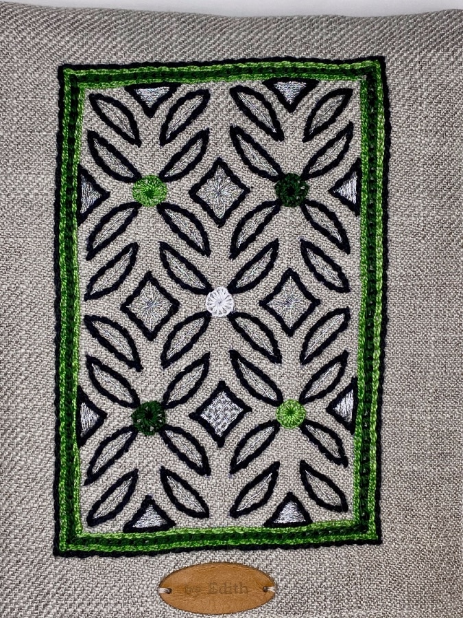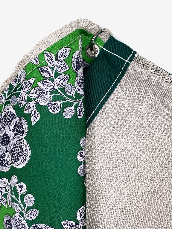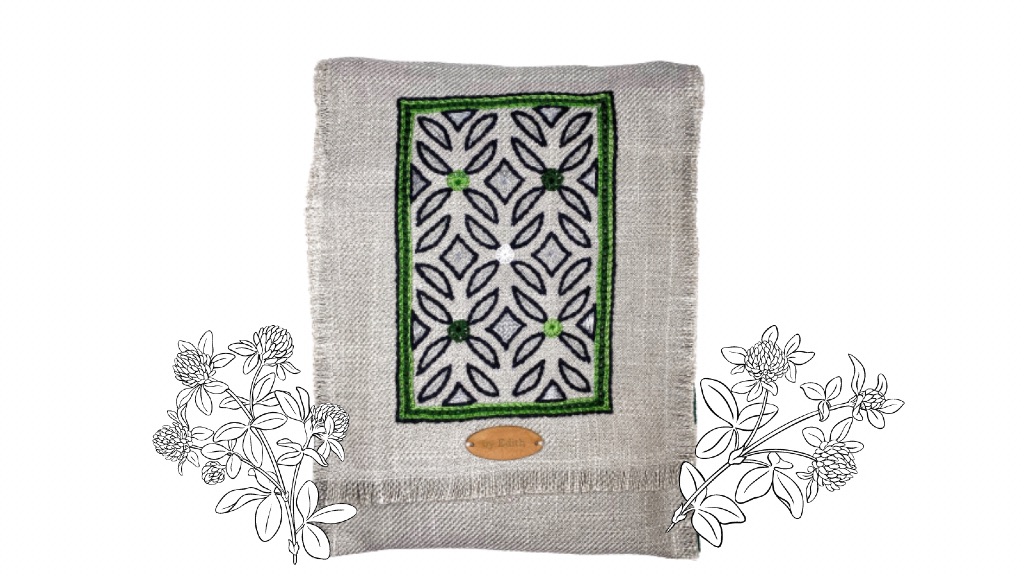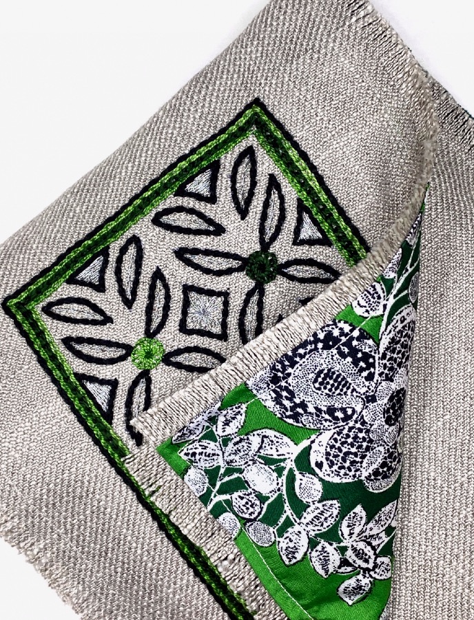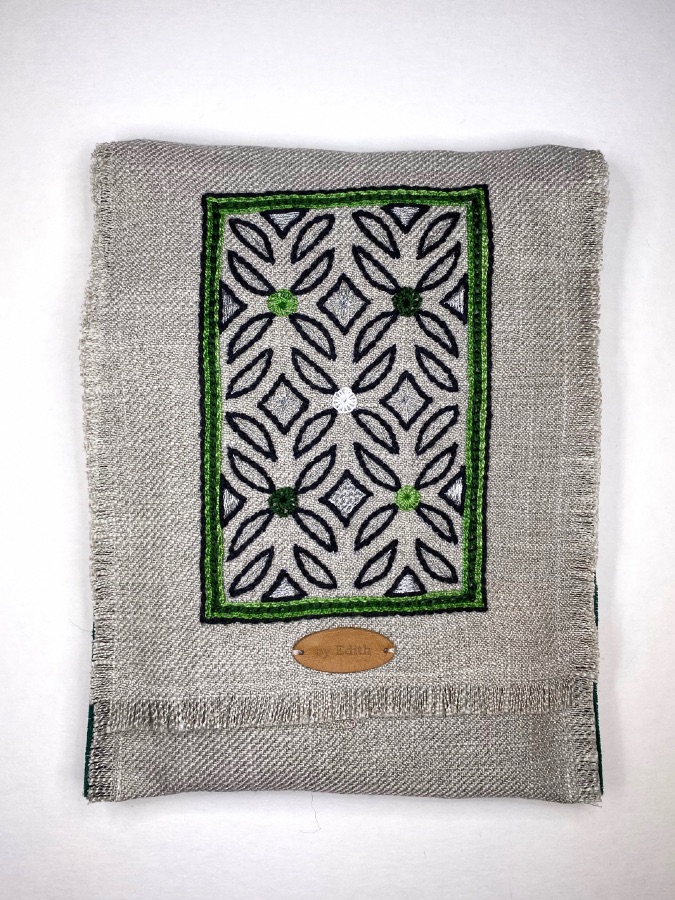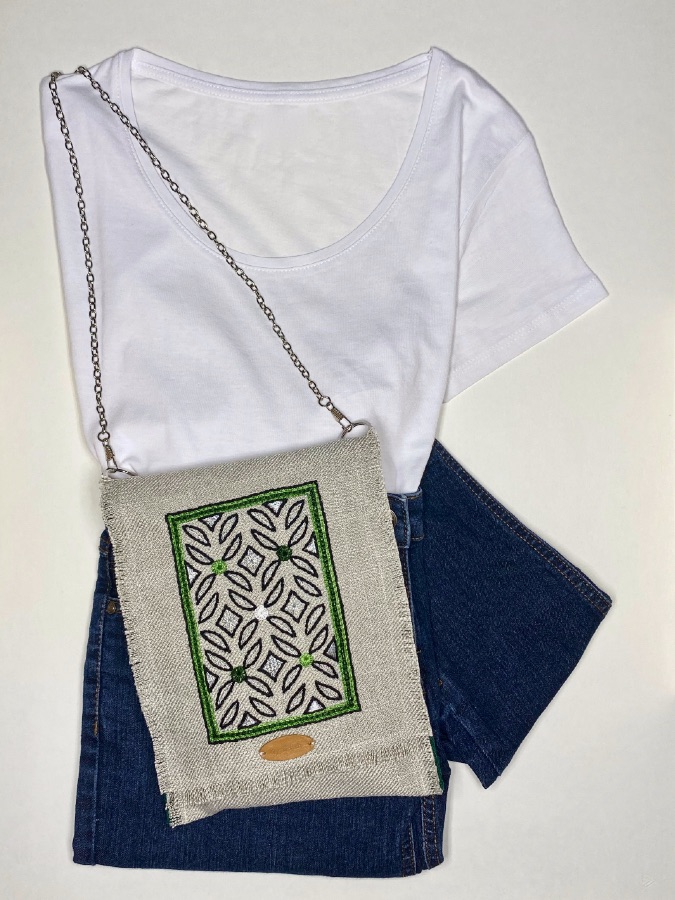 La frise à motif végétal est brodée à la main et à l’aiguille sur le tissu avant le montage du sac. Les coutures du sac sont faites à la machine pour plus de solidité.