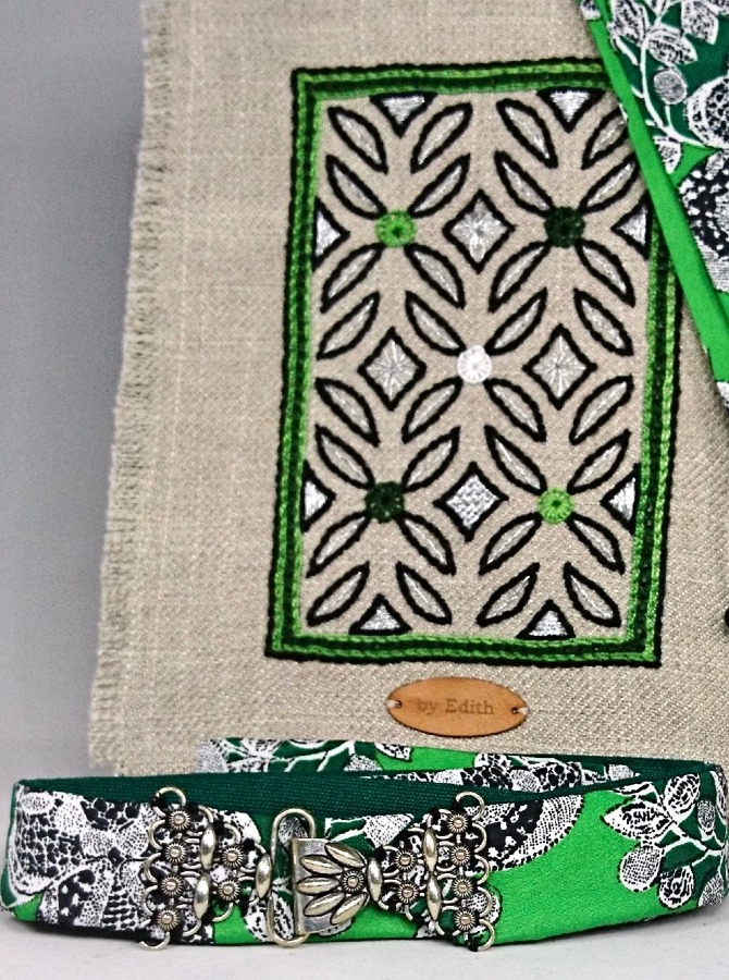 Sac bandoulière élégamment brodé très pratique pour téléphone. Le motif est réalisé en broderie main à l’aiguille. Vendu avec bandeau cheveu et ceinture assortis. Modèle unique