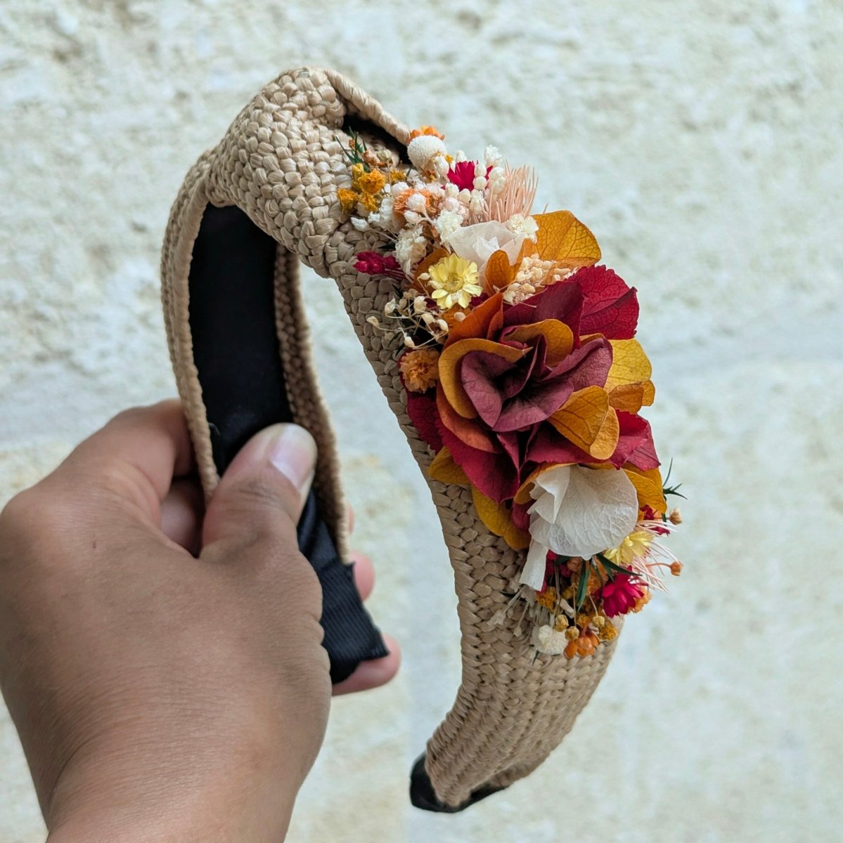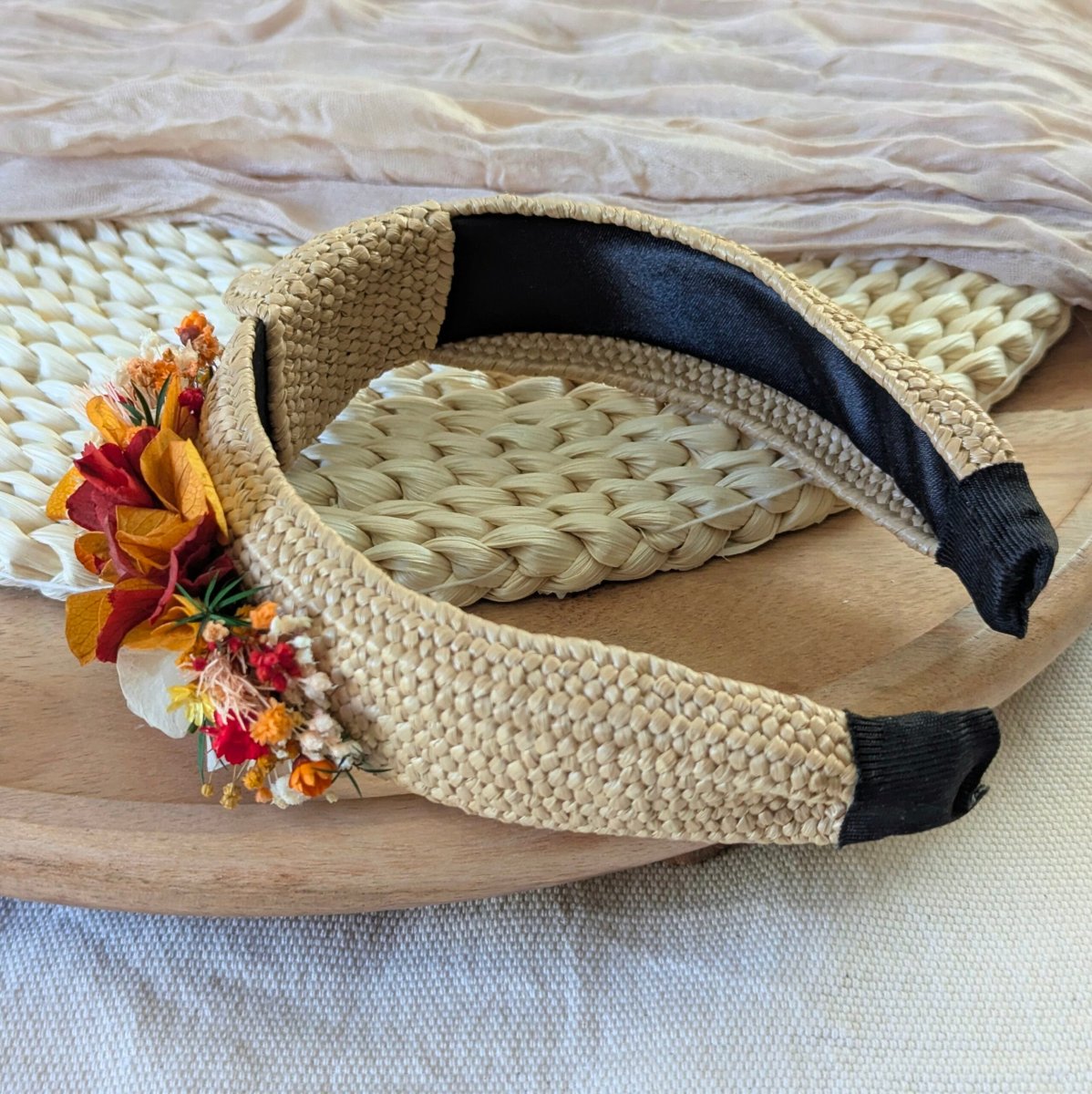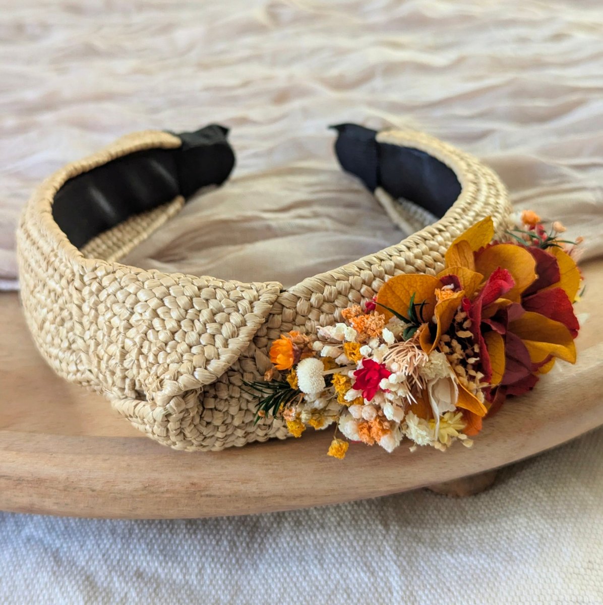 Le serre-tête Coco Cinelle mêle l’authenticité du raphia tressé au charme délicat des fleurs séchées et stabilisées. Orné de nuances vibrantes : rouge, orange, vert, beige et rose, ce bijou de tête unique incarne l’élégance naturelle et l’esprit bohème. Entièrement façonné à la main dans mon atelier bordelais, il allie savoir-faire artisanal et créativité florale pour sublimer toutes vos coiffures avec style.